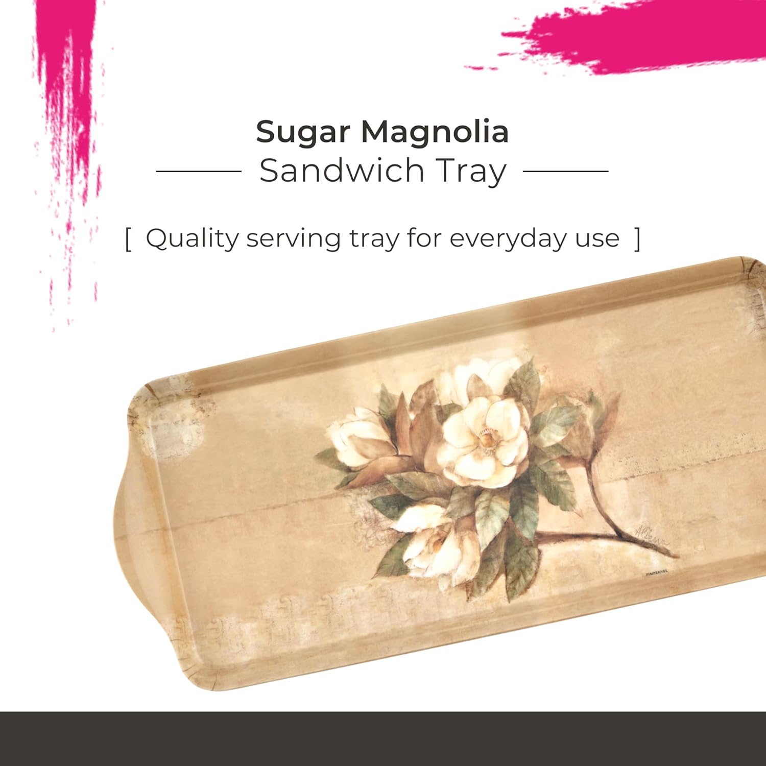 Pimpernel Sugar Magnolia Sandwich Tray - Rectangular Melamine Snack Tray with Blooming Floral Design, Pink & Green Tones - Dishwasher Safe Serving Platter for Breakfast Pastries or Decorative Display