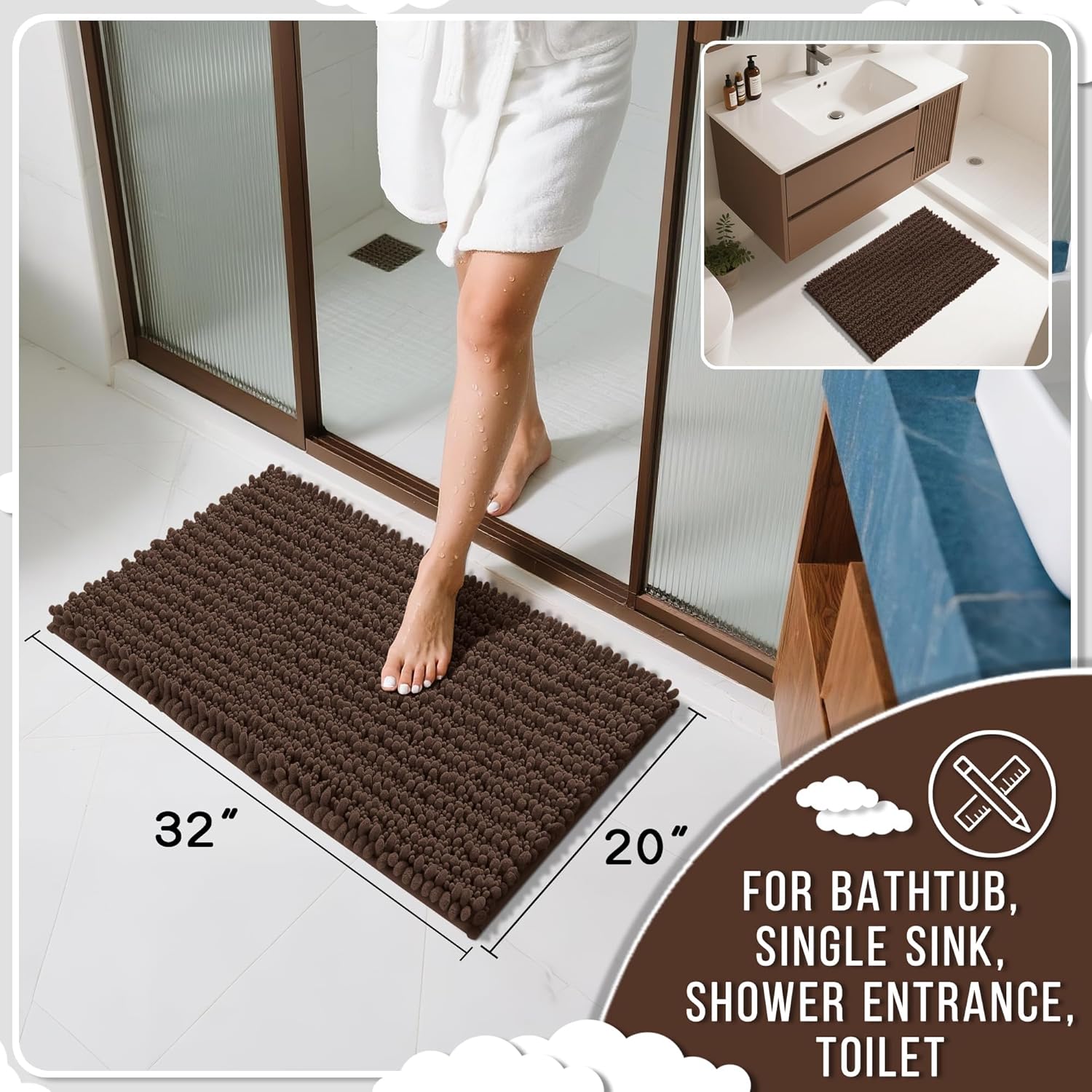 Yimobra Bathroom Rugs Non Slip Washable 32x20 Inch - Ultra Soft Absorbent Chenille Bath Mat, Quick Dry Shaggy Floor Carpet for Tub Shower, Brown Home Decor Accessories