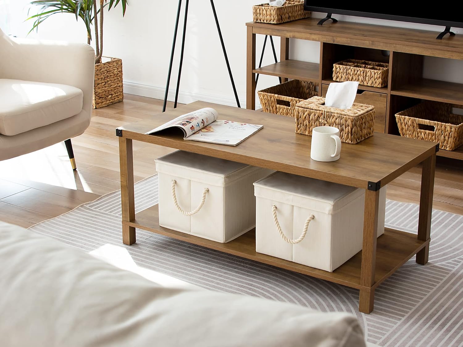 - Thick fabric storage boxes with lids reinforced with heavy-duty boards.