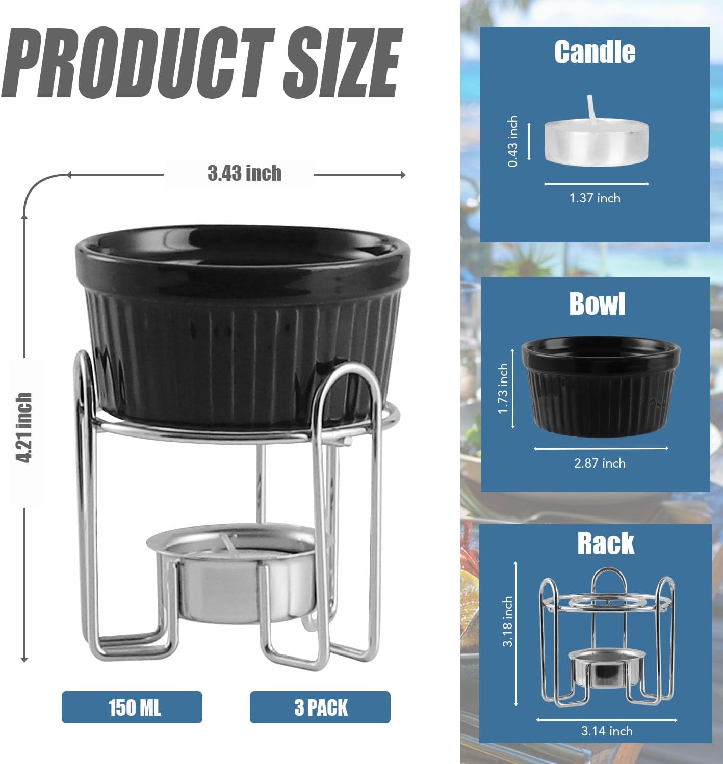 - BIGGER CAPACITY - Our butter warmers have an adequate capacity of approximately 5.1 oz/ 150 ml, large enough to hold a decent amount of anything, making them a nice portion for lobster crab. The candles and metal stands have the ideal dimensions, about 1.37 x 0.43 inches for the candles, and about 3.14 x 3.18 inches for the stands, offering a practical and compact design, durable for long-term use. Fancy enough to use on any occasion!