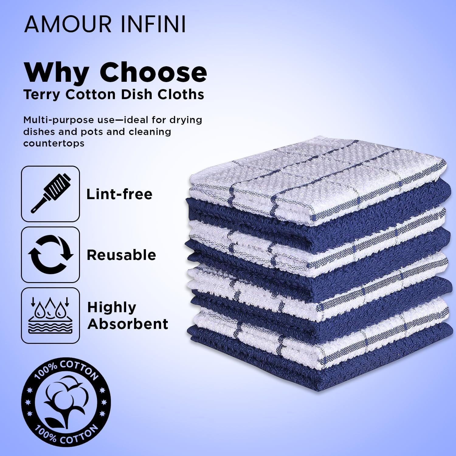 AMOUR INFINI Cotton Kitchen Dish Cloths Set of 8 – Highly Absorbent, Super Soft Premium Terry Cleaning Cloth (12"x12" Inch) Premium Dishcloths for Washing Dishes (Blue)