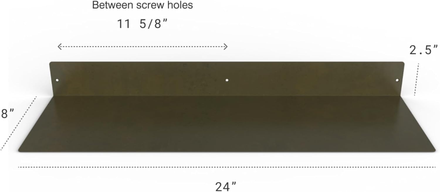 - DIMENSIONS & DETAILS: Measuring 24-inches long x 8-inches in depth, our steel floating shelf is made from 14 gauge raw steel. The weight of the shelf is 5 LBS. It's perfect for displaying books, plants, bottles, picture ledges, and retail displays