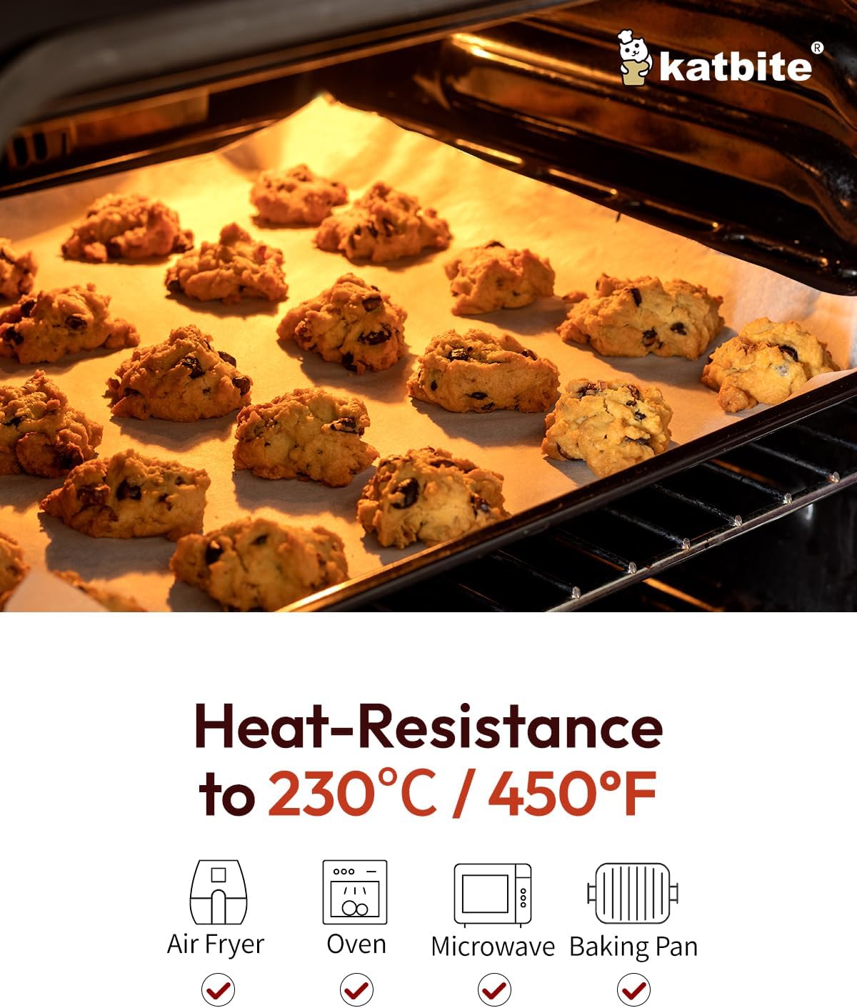 - MULTI-PURPOSE—Do you think parchment baking sheets is only used for food baking? NO! Because Katbite parchment paper's temperature resistance is from -68° F to 450° F, you can find it everywhere in kitchen whether in freezer, microwave or air fryer as long as you can think of it.