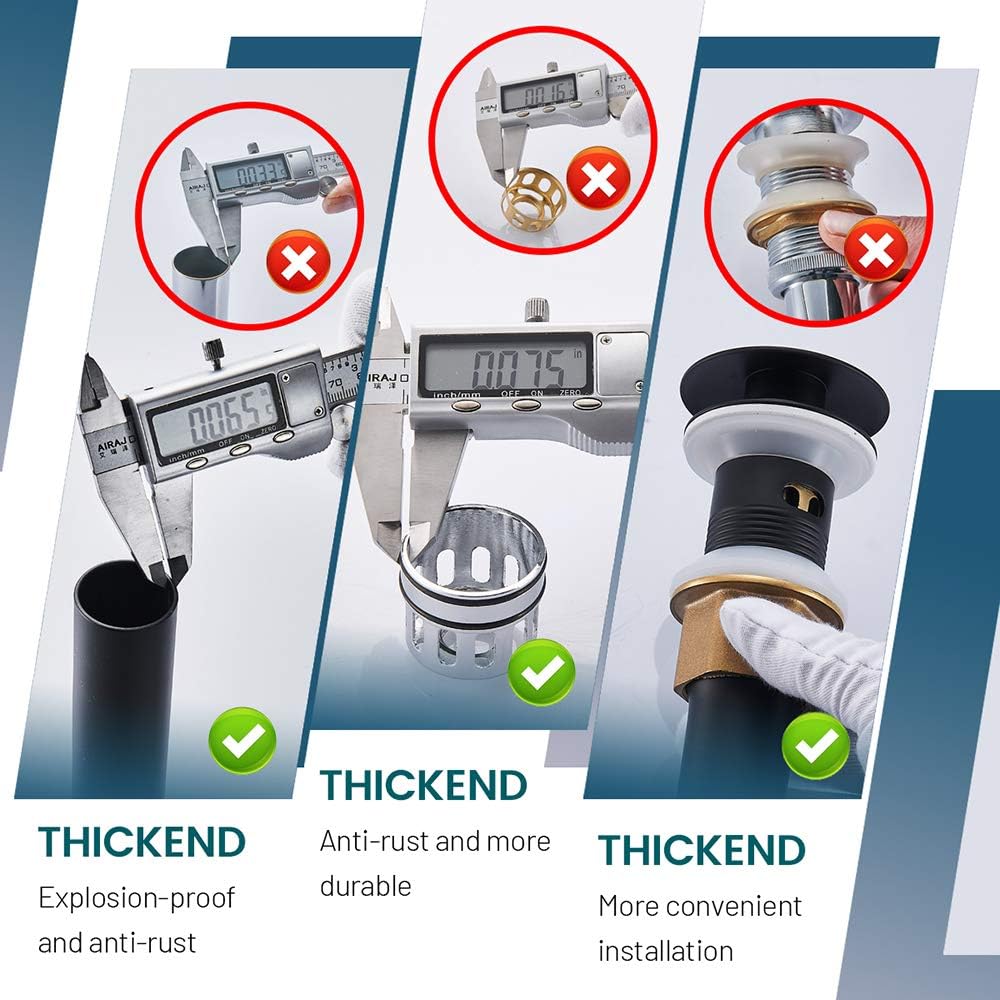 - 【EASY INSTALLATION】Anyone can install a pop up drain due to its simple construction,no tools required, the thickened and extended nut allow it to be mounted by bare hand.Fits standard american bathroom sink with 1-1/2" to 1-3/4 inch drain hole(1.45 to1.96 inches).