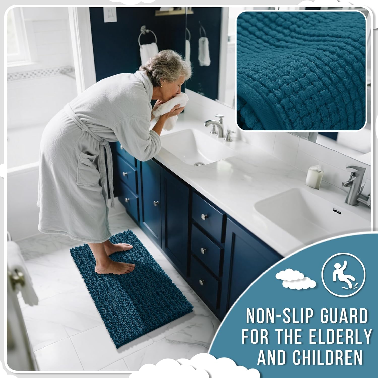 - Ultimate Cloud-Like Soft Comfort: Experience walking on clouds with our extra thick chenille bathroom mat! The ultra plush high pile density cradles your feet, banishing cold tiles after showers. It is perfect for adding warmth to any bathroom floor, transforming routine steps into luxury moments