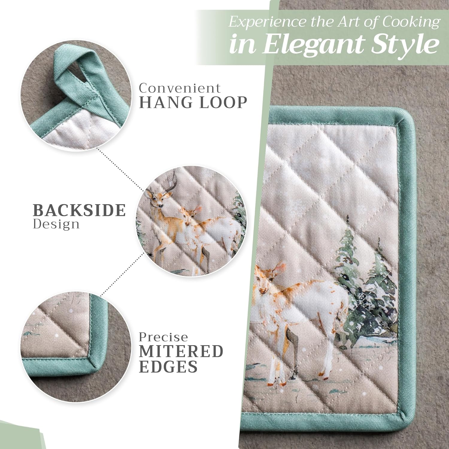 Maison d' Hermine Pot Holders Set 100% Cotton Heat Resistant Potholders 8" x 8" Hot Pads with Loop BBQ, Cooking, Baking, Grilling, Kitchen, Handling Hot Pans (Pack of 2, Deer in The Woods)