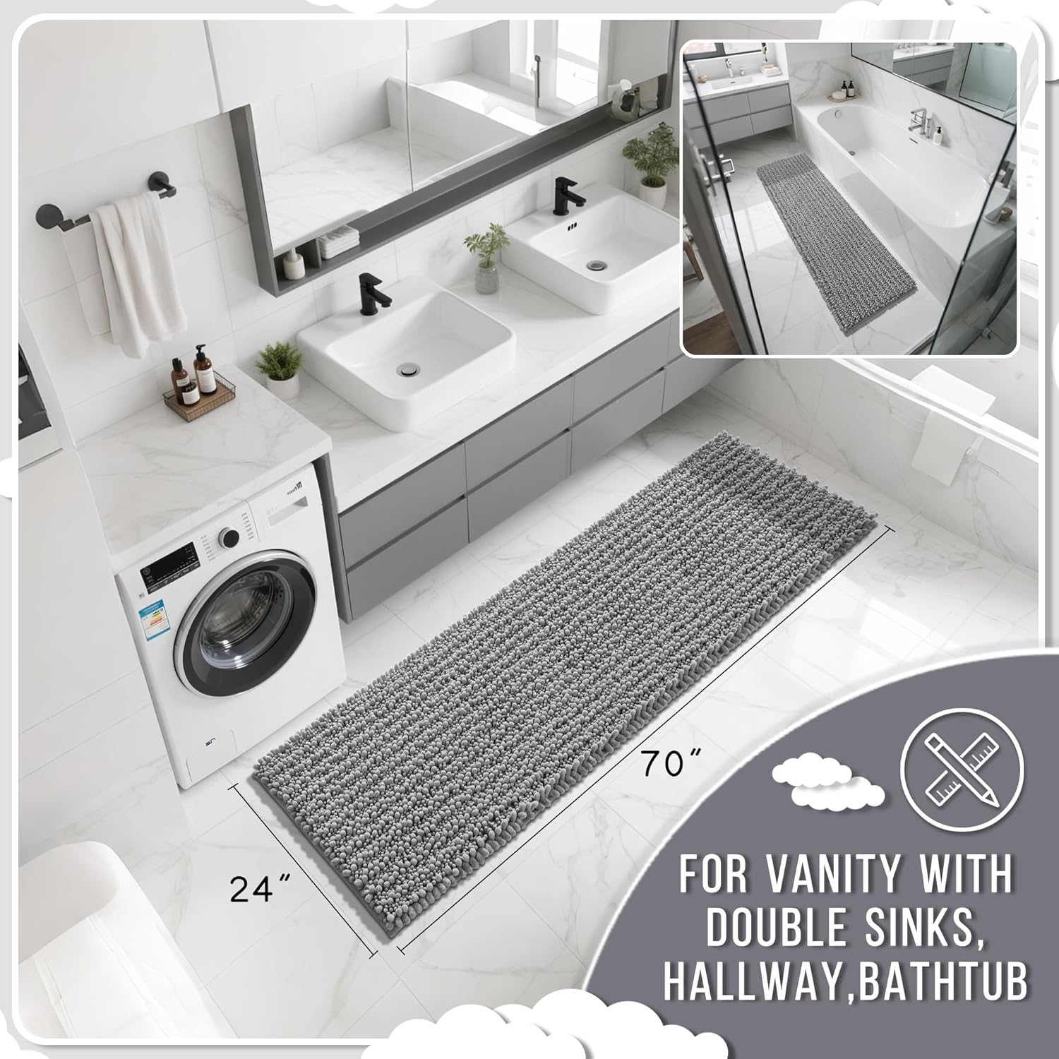 Yimobra Bathroom Runner Rug 70x24 Inch - Extra Long Non Slip Chenille Bath Mat, Soft & Absorbent, Machine Washable Shaggy Hallway Carpet for Vanity Tub Shower, Gray Home Decor Accessories