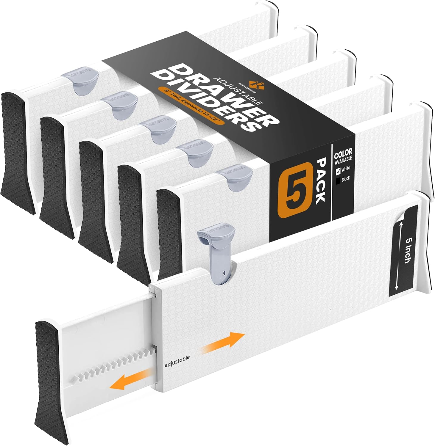 RAPTUROUS Adjustable Deep Drawer Divider – 5" Tall, Expandable 13-22", 5-Pack, Non-Slip Drawer Dividers for Clothes, Dresser, Kitchen & Office Organization (White)
