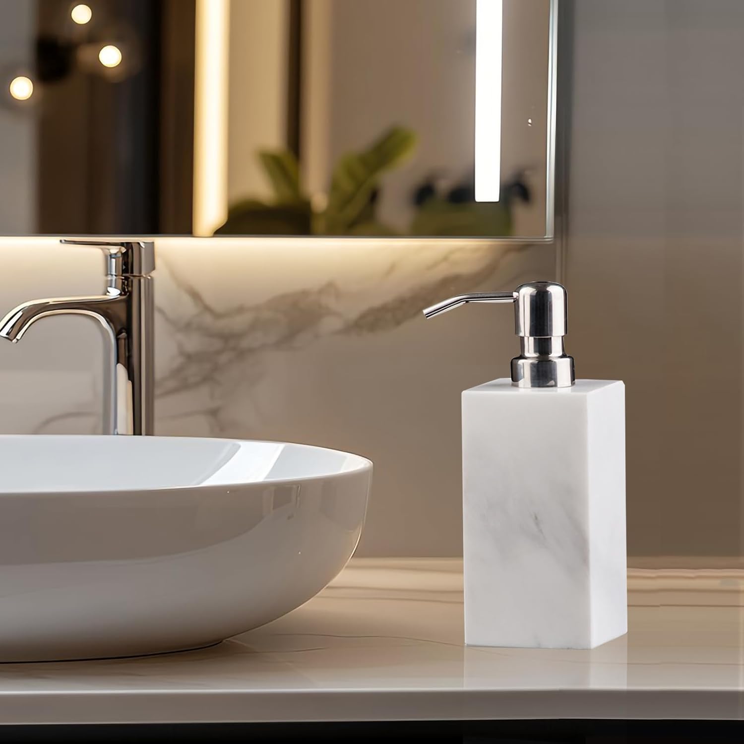 Hand Liquid&Lotion Soap Dispenser Pump Bottle Natural Marble for Kitchen Bathroom Countertop Laundry Room Holds Dish Soap Shampoo Laundry Liquid Shower Gel (Sir White)