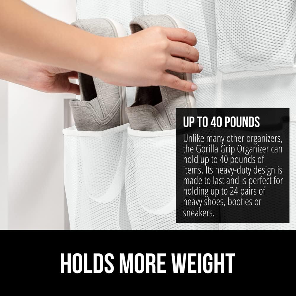 GORILLA GRIP Over the Door Shoe Organizer, 24 Large Breathable Mesh Pockets, Space Saving Hanging Storage Holder, Closet Rack Hanger Holds Up to 40 lbs, Hangs on Closets for Shoes, Accessories, White