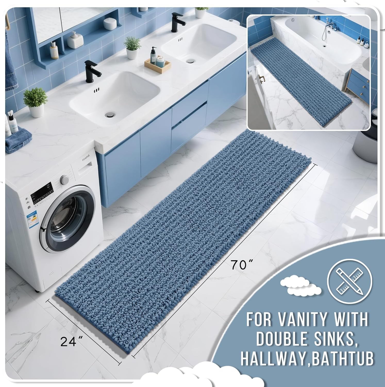Yimobra Bathroom Runner Rug 70x24 Inch - Extra Long Non Slip Chenille Bath Mat, Soft & Absorbent, Machine Washable Shaggy Hallway Carpet for Vanity Tub Shower, Denim Blue Home Decor Accessories