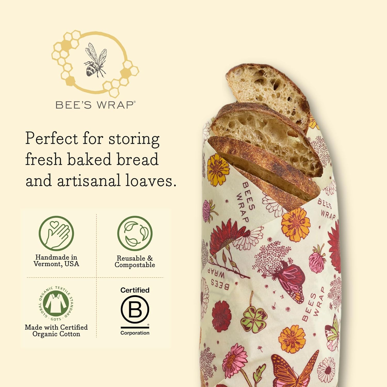 Bee's Wrap Vegan Beeswax Wraps for Food - Vegan Meadow Magic Bread Wrap - Made in USA Reusable Bread Storage Bags - Organic & Eco-Friendly Alternative to Aluminum Foil, Sourdough Bags & Plastic Wrap