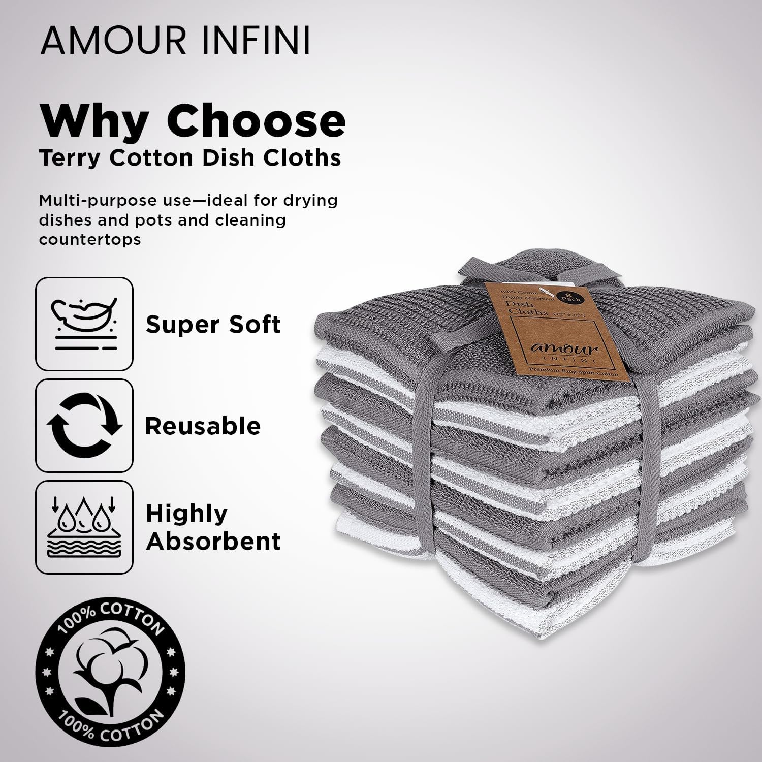 AMOUR INFINI Dish Cloths for Washing Dishes Set of 8 - Highly Absorbent, Super Soft Kitchen Dishcloths - Reusable Quick Dry Dish Rags for Cleaning & Drying Kitchen Linens (12x12 Inch - L.Grey)