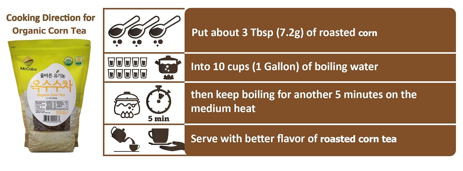 - Easy Brewing: Brewing the perfect corn tea is a breeze with McCabe Organic. Just add about 3 tablespoons (7.2g) of Roasted Corn to 10 cups (1 gallon) of boiling water and let it simmer on medium heat for 5-7 minutes. Enjoy it hot or cold according to your preference.