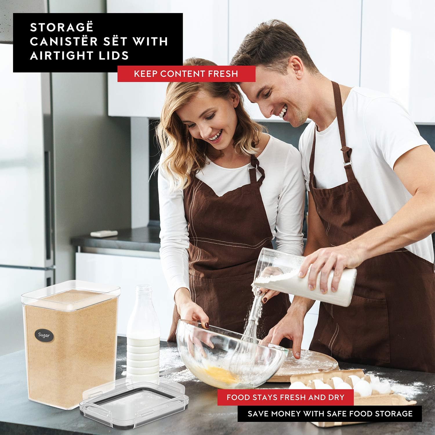 - Kitchen Organization: This set of two flour and sugar containers (5.5 qt / 5.2 liters) is perfect for organizing your pantry. Use them for flour, sugar, baking supplies, oats, rice, or pasta. The kitchen storage containers set comes in a beautiful box, making it an ideal gift!