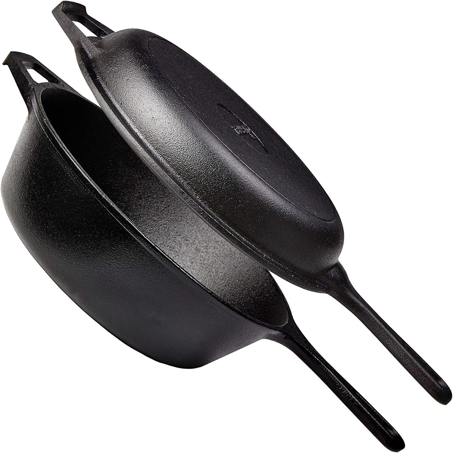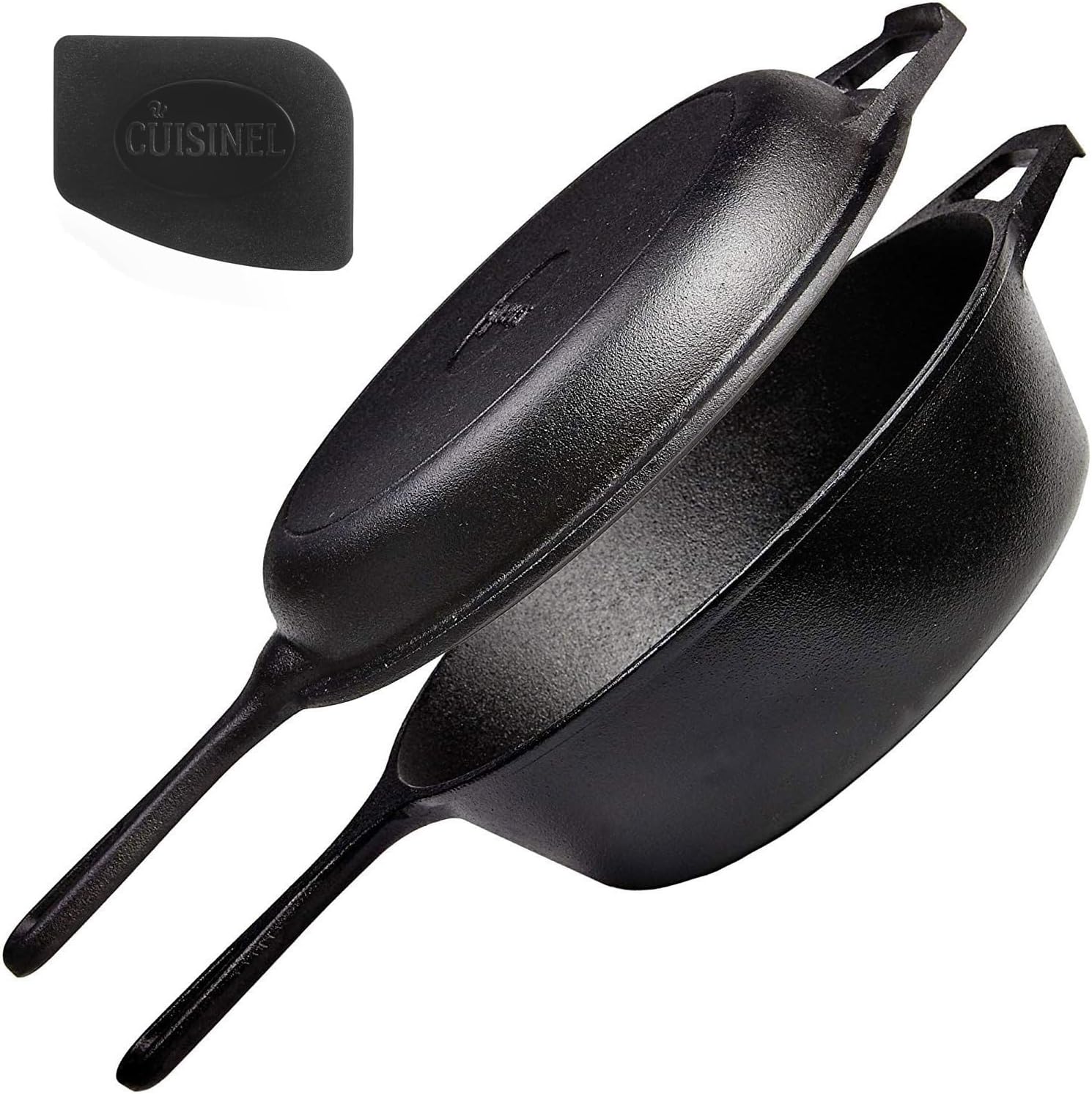 Cuisinel Cast Iron 2-In-1 Multi Cooker - 3-Quart Dutch Oven and Skillet Lid Set Oven Safe Cookware + Black Pan Scraper - Use As Dutch Oven and Frying Pan - Indoor and Outdoor Use - Grill, Stovetop