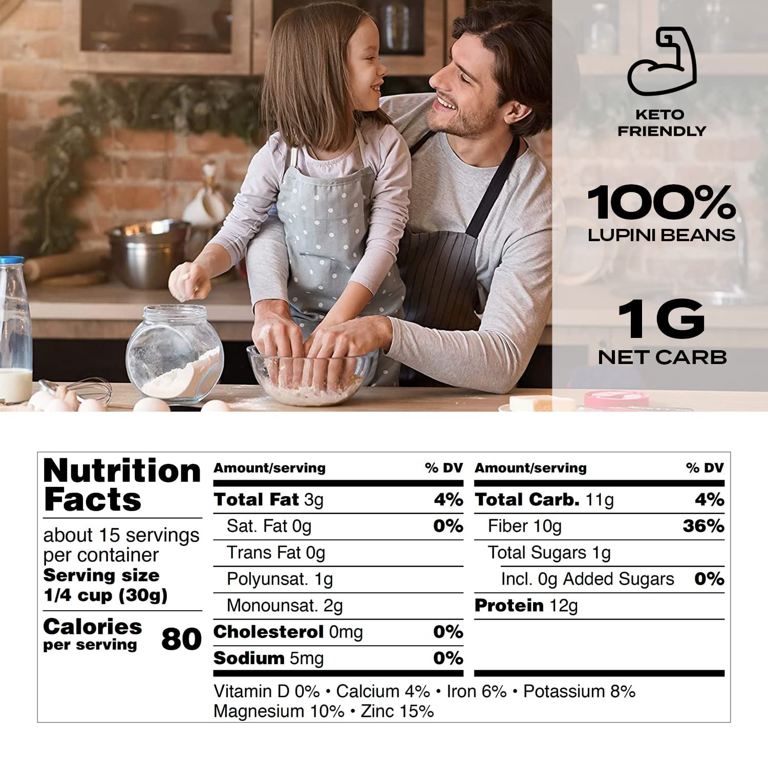 - 𝐊𝐄𝐓𝐎 & 𝐕𝐄𝐆𝐀𝐍 𝐅𝐑𝐈𝐄𝐍𝐃𝐋𝐘 – Lupini flour is perfect for those following a low-carb or vegan diet. Enjoy traditional recipes while achieving your nutritional goals! In one serving size of Lupin Flour you will be getting 36% of your daily fiber as well as 10% of your daily Magnesium, perfect for a Keto or Vegan diet! This includes ZERO grams of added sugars. This flour has 3X the potassium of bananas, 2X the iron of kale and 7X the fiber of orzo!