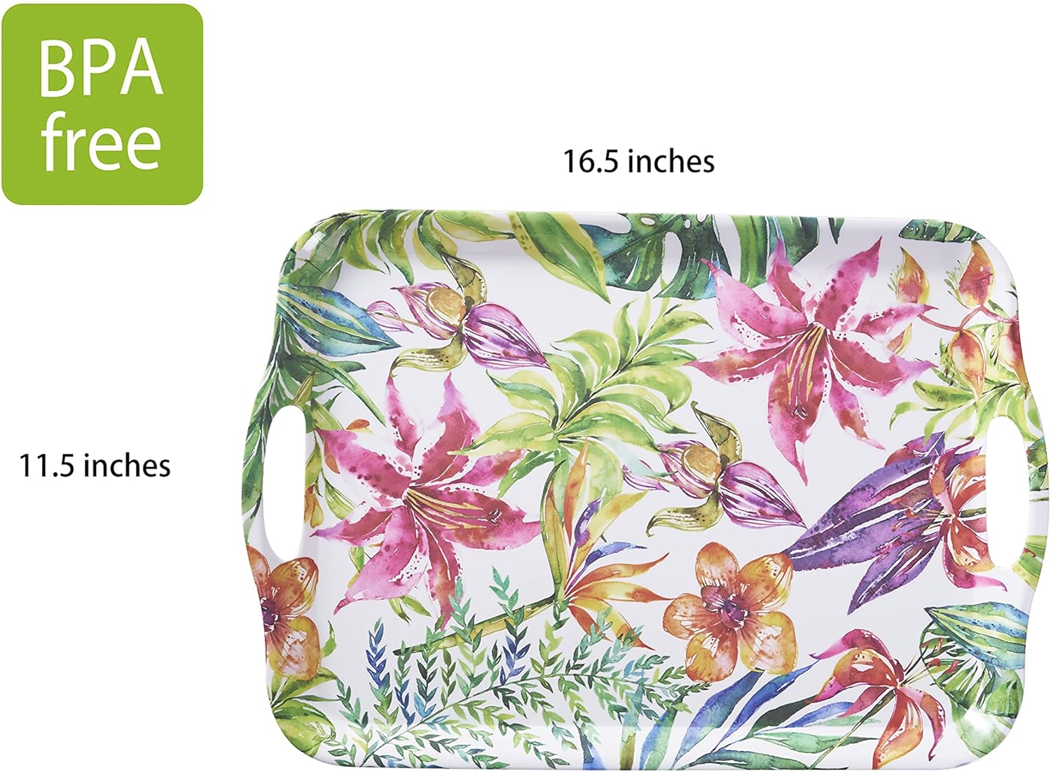 Blue Boat 16.5" x 11.5" Rectangular Serving Trays Set of 2 Floral, Light Weight Easy to Clean Sturdy Stackable Melamine Serving Tray with Handle, Fruit, Snacks, and Desserts Trays