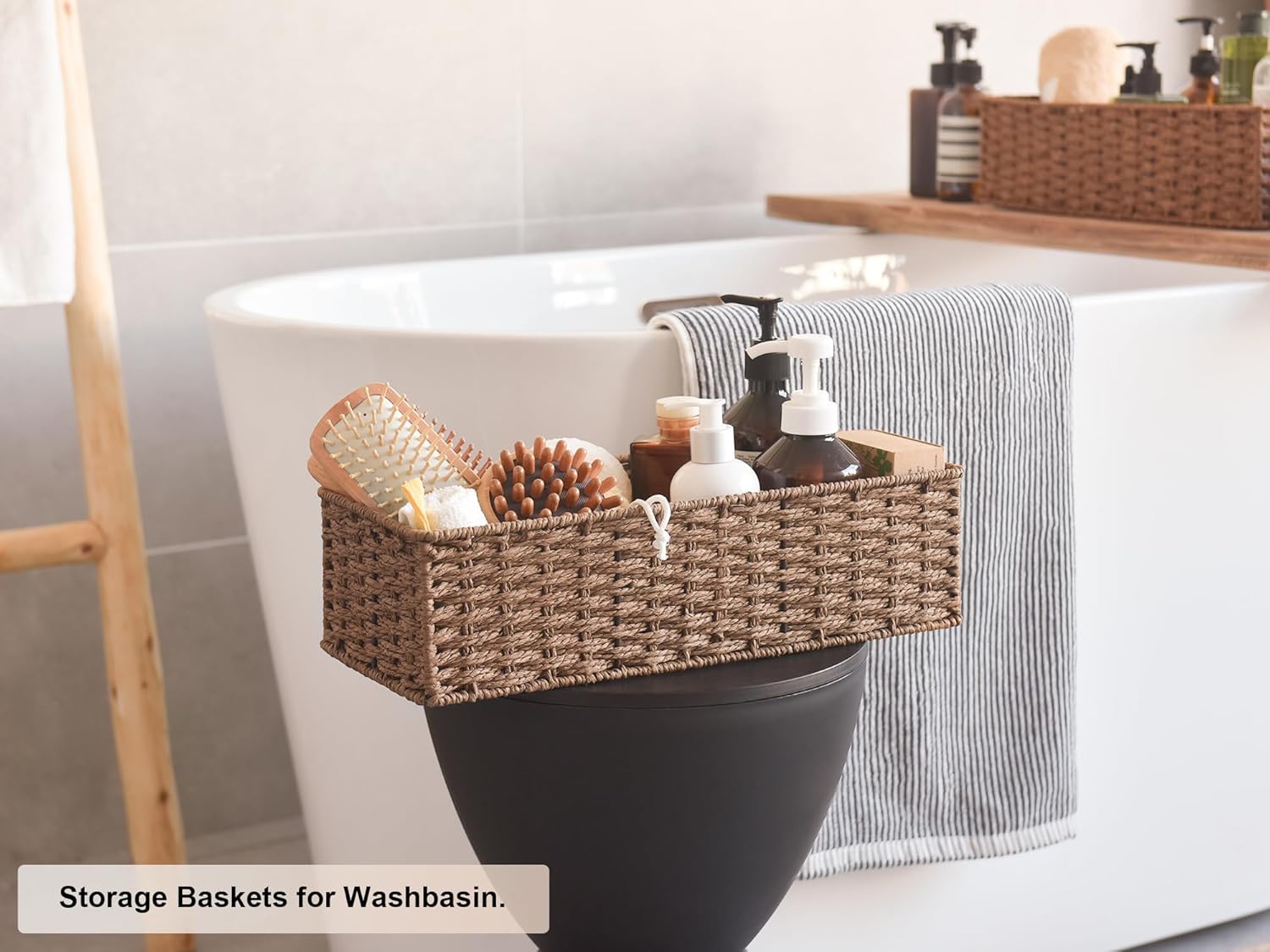 - The bathroom wicker baskets are made of round paper rope, a clean and renewable resource.