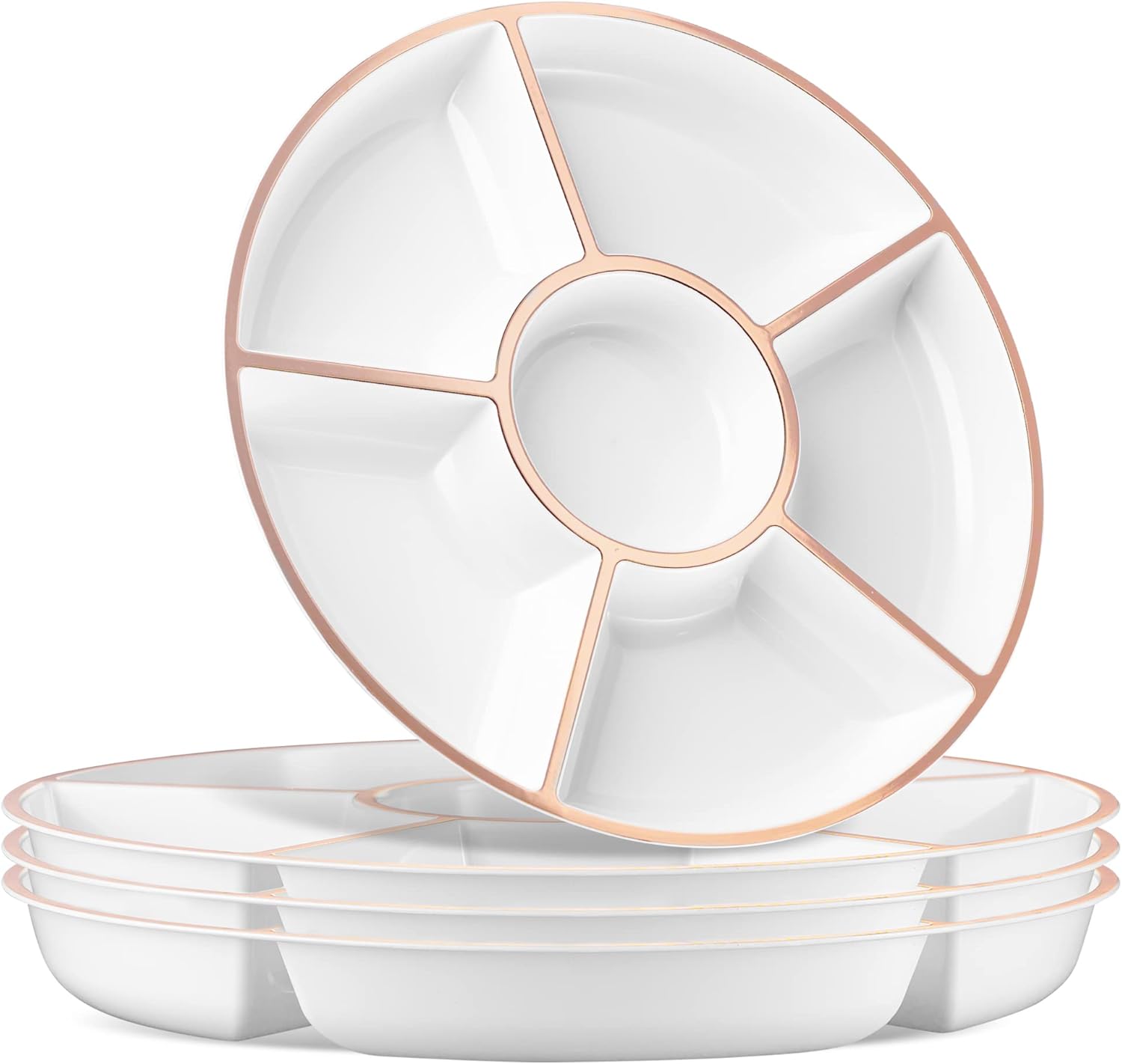 Plasticpro 6 Sectional Round Plastic Serving Tray/Platter (4, White & Rose Gold)