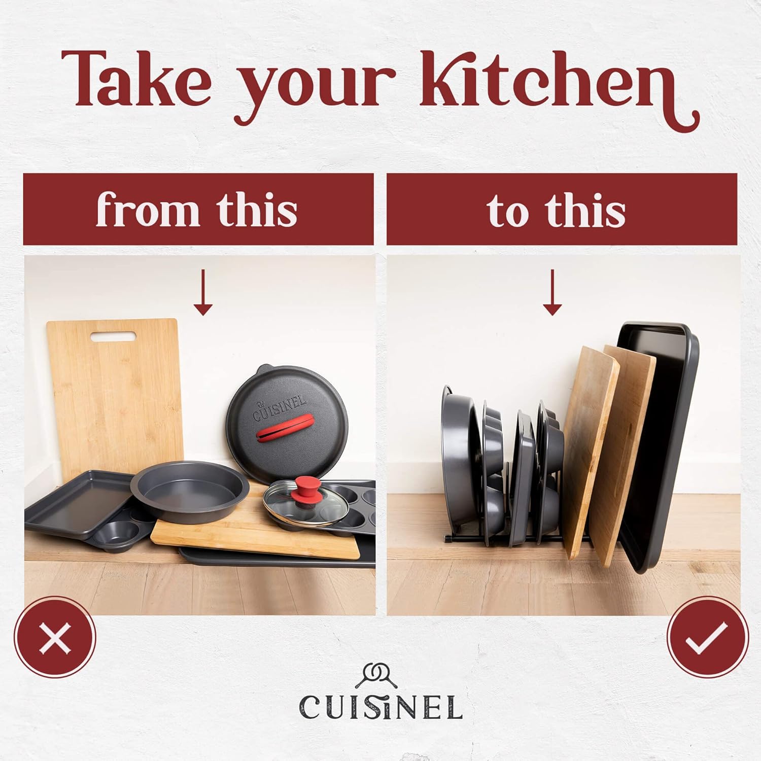 Cuisinel Lid and Dish Organizer Rack - Satin Nickel Silver Kitchen Storage Organization Stand - Plate Holder, Pan/Pot Covers, Cutting Board and Cookie Sheet Divider - 7-Tier Cabinet/Counter Display