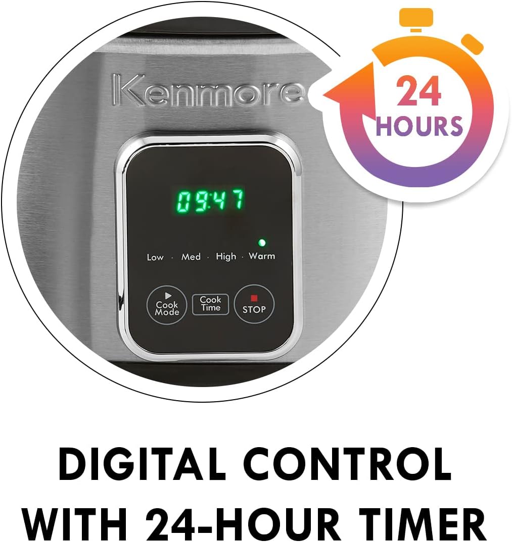 - FOUR TEMPERATURE SETTINGS WITH ONE-TOUCH CONTROLS - Use the simple controls and clear digital led display to set your kenmore 7 quart slow cooker to low, medium, high, or warm. These settings allow you to customize the cooking process to suit your recipe and needs, ensuring perfectly cooked meals every time.
