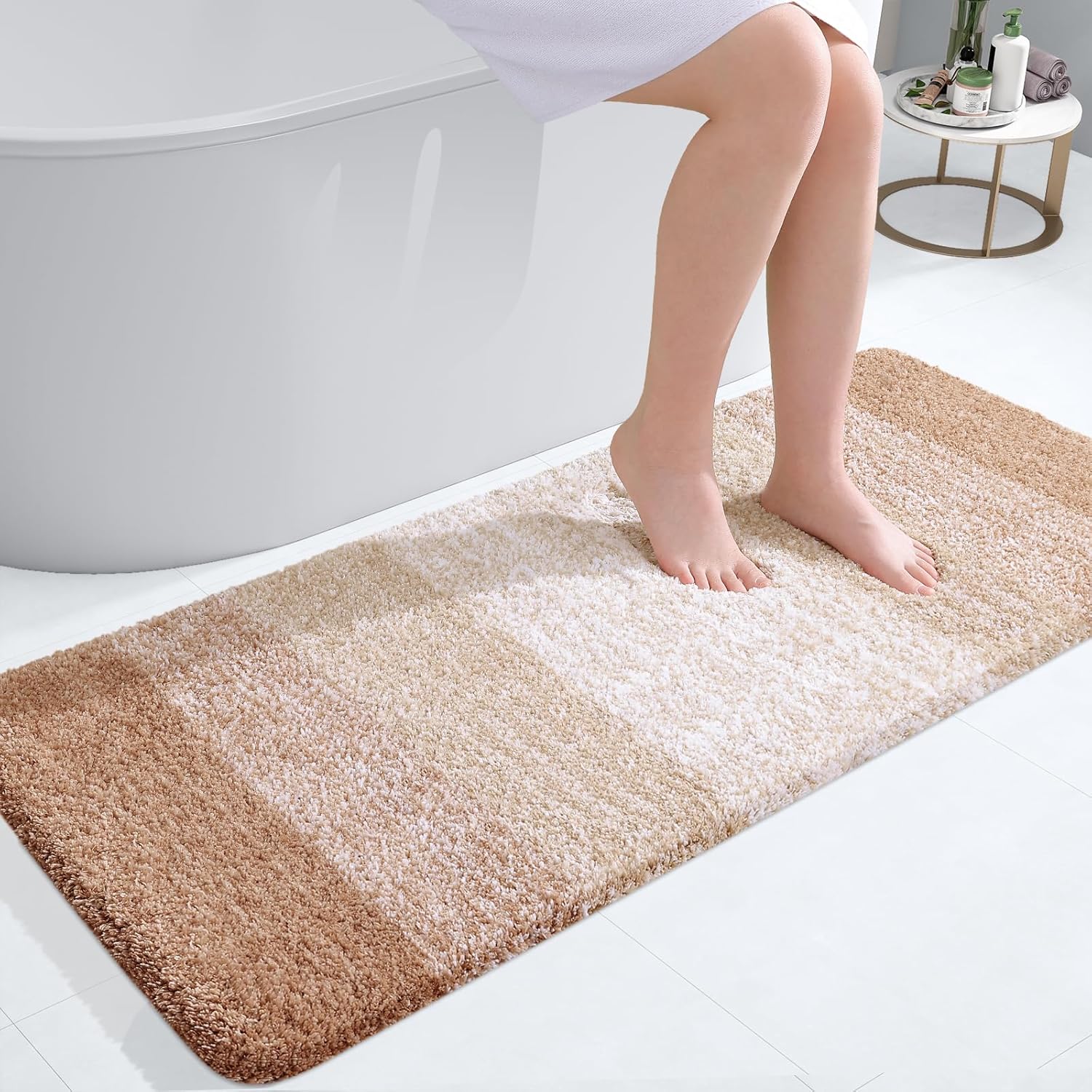 - [Luxuriate in Pure Comfort] Indulge your feet in the softest, coziest microfiber imaginable. With its plush pile, nearly one inch thick, our bath mat soothes and warms your feet, protecting them from the cold floor below. Enhance your bathroom decor with OLANLY's captivating bath mat. The gradient color stripe design seamlessly merges stripes, creating an eye-catching pattern that infuses sophistication into your space.