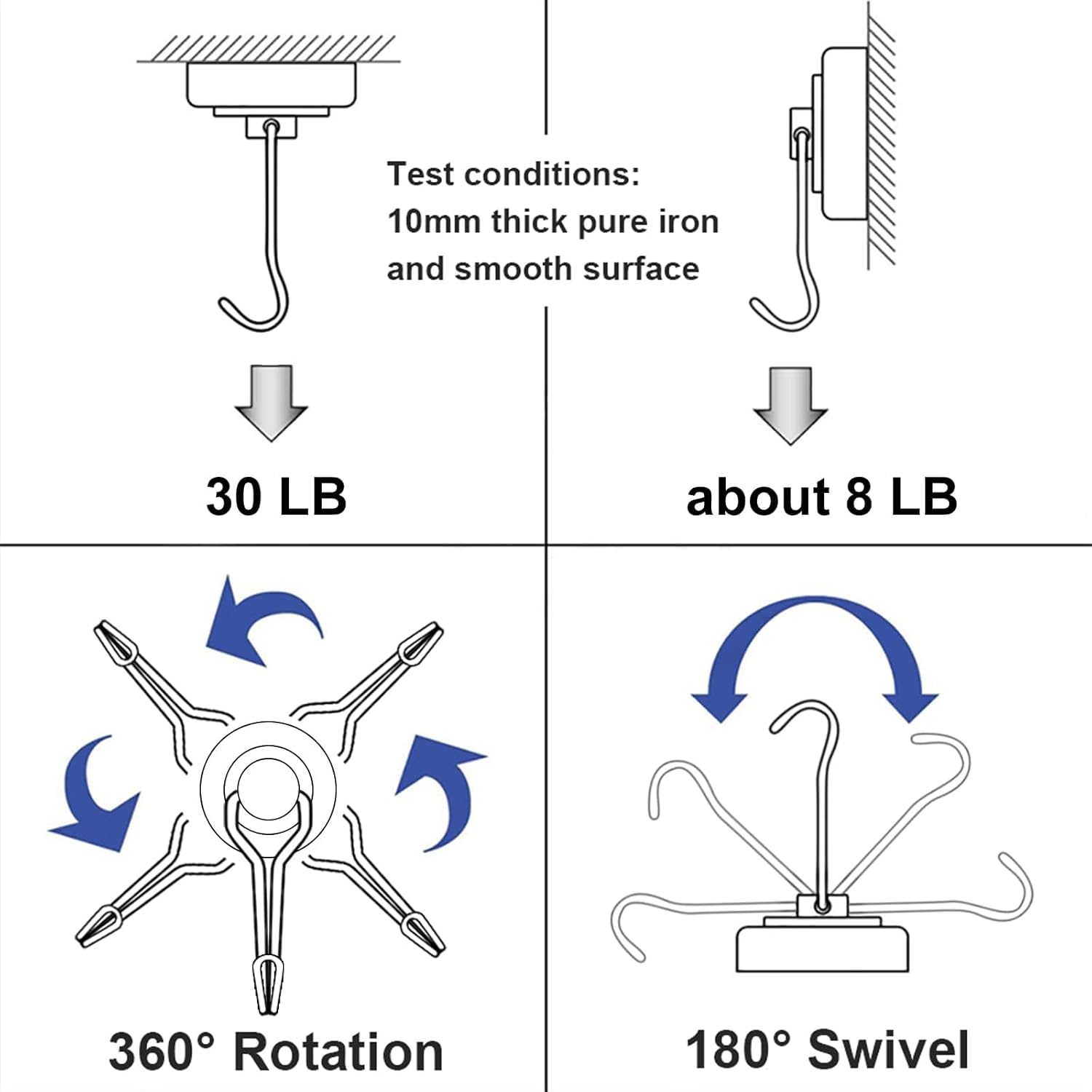 - 【Industrial Grade】: Black Magnetic hooks 30LBS Capacity is based on horizontal application -- reduced by 2/3 if used vertically.The magnetic hook is 60mm(2.36in) in length.