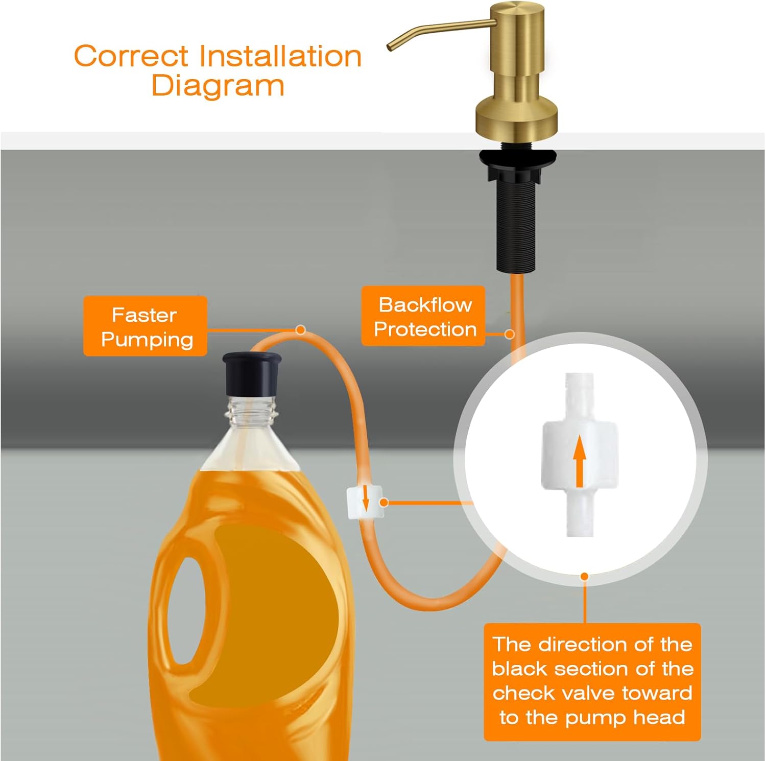 - Premium Quality & Durable: The kitchen sink soap dispenser is made of 304 stainless steel and premium quality PE plastic. Multi-layered brushed nickel finish makes it rust proof, so it has higher durability and reliability. Food-Grade silicone tube is soft and elastic, not easy to bend under the countertop, the check valve make the soap prime in the tube.