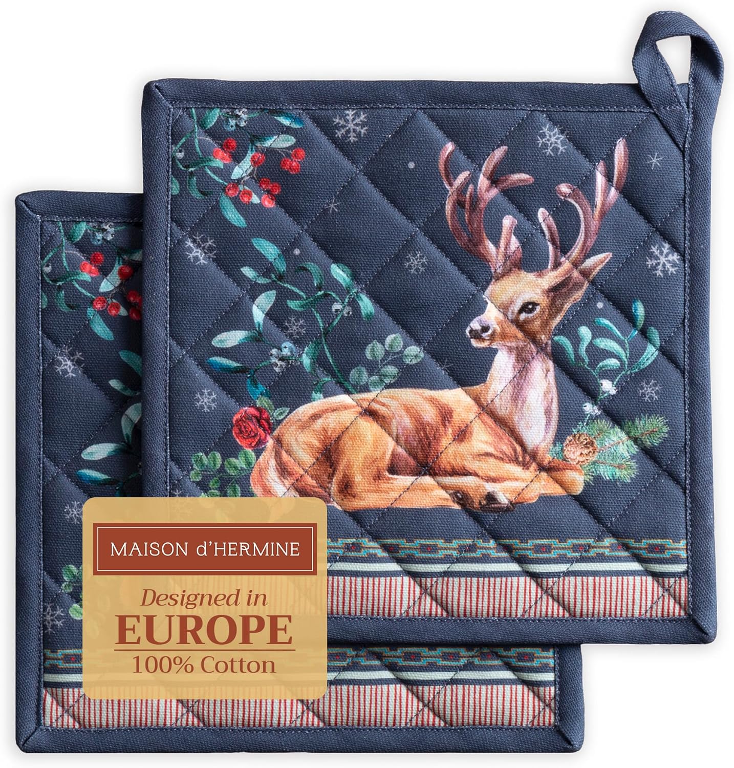 Maison d' Hermine Pot Holders Set 100% Cotton Heat Resistant Potholders 8" x 8" Hot Pads with Loop BBQ, Cooking, Baking, Grilling, Kitchen, Handling Hot Pans (Pack of 2, Christmas Joy)