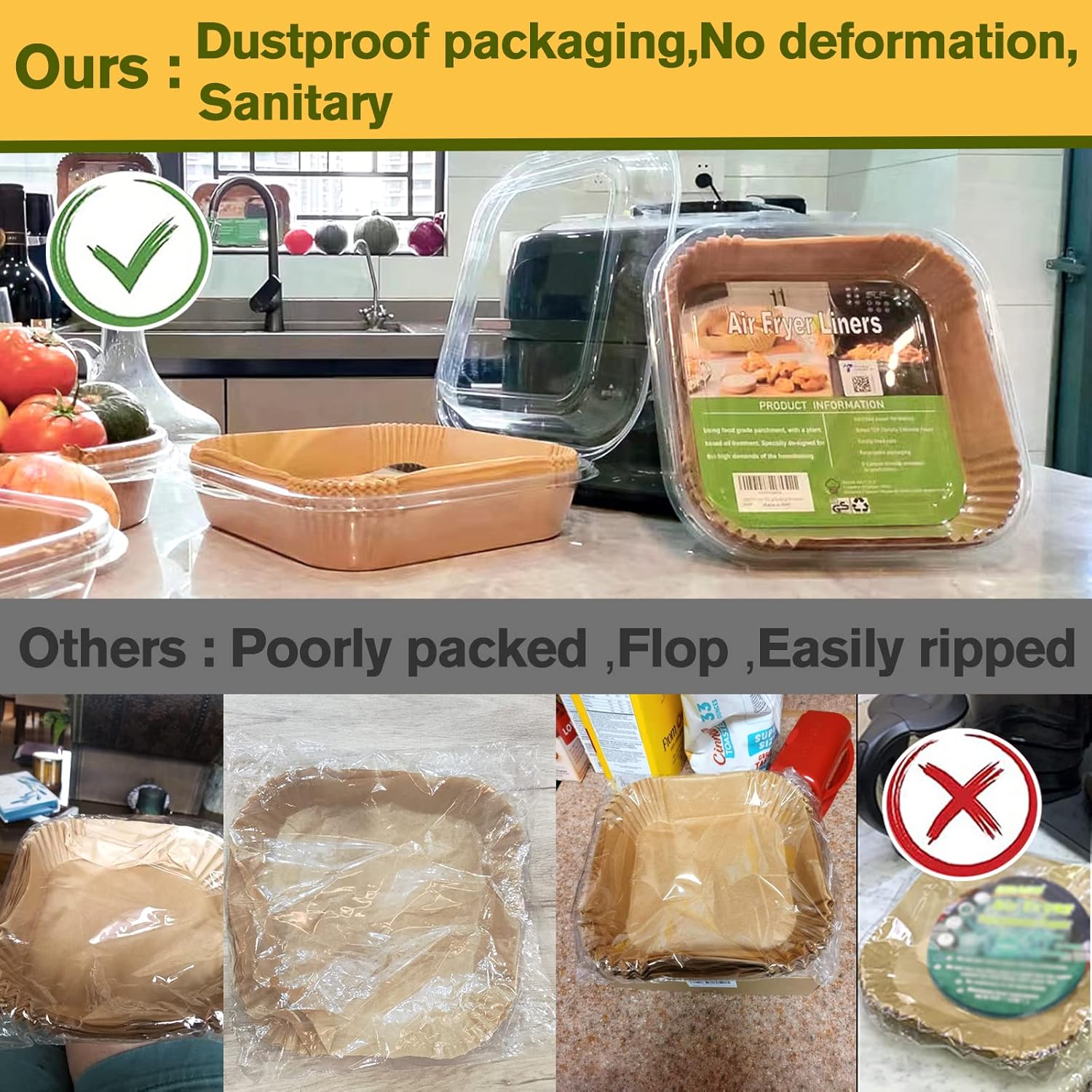 - 【Easy to Use】These non-stick air fryer disposable paper liner are designed with a square bowl shape, which do not need to tear, fold, cut, nor bend, and you can directly put it in when you are ready to cook. Its heightened edge 4.5cm can protect the side of fryers and prevent food from sticking to them.