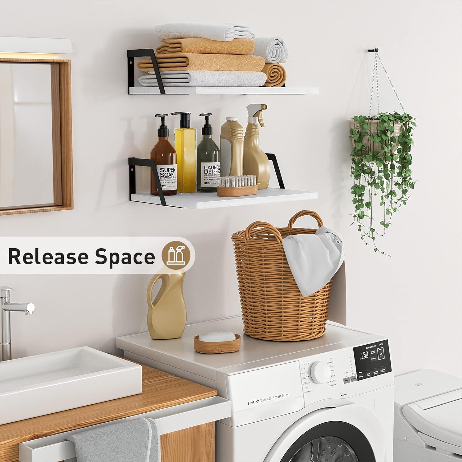 - Functional Wall Shelves: Versatile wood shelves allow you to exhibit photos or plants in the living room, hold beauty products in the bathroom , or hold spices and jars in the kitchen.