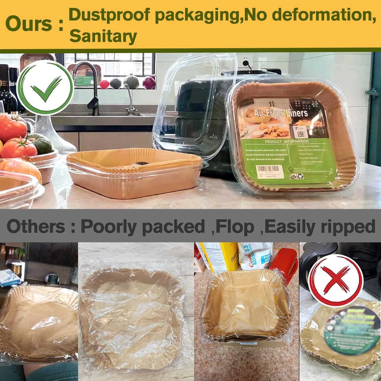 - 【Easy to Use】These non-stick air fryer disposable paper liner are designed with a square bowl shape, which do not need to tear, fold, cut, nor bend, and you can directly put it in when you are ready to cook. Its heightened edge 4.5cm can protect the side of fryers and prevent food from sticking to them.