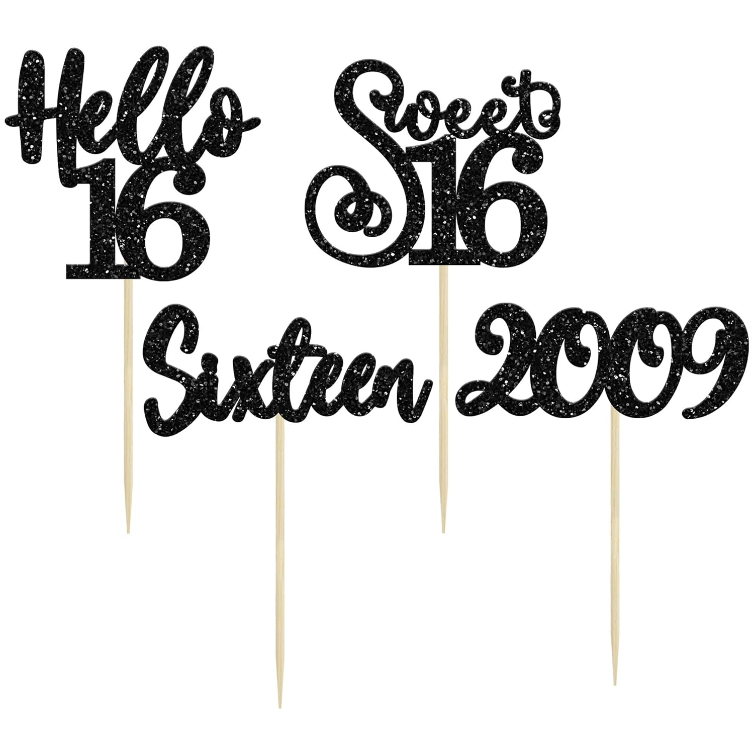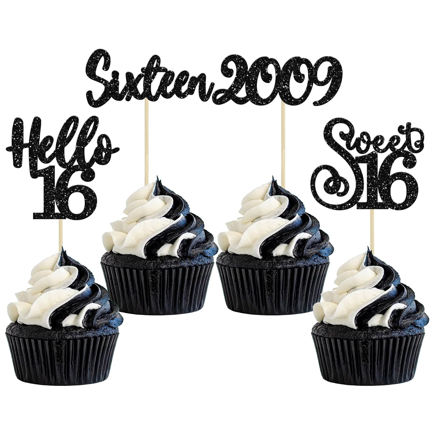 Gyufise 24Pcs Happy 16th Birthday Cupcake Toppers Glitter Hello 16 Sweet 16 Cupcake Picks 2009 Sixteen Old Birthday Cake Decorations for 16th Birthday Anniversary Party Supplies Black
