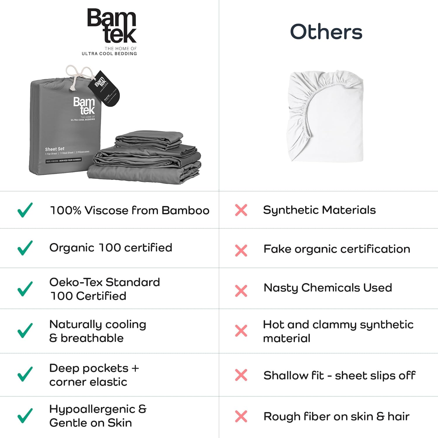 - Because You Deserve Better: Say goodbye to harsh chemicals, Bamtek 100% Viscose Bamboo Sheets are organically certified & Oeko Tex standard 100 certified - skin friendly, a hypoallergenic bedding and those who value pure natural comfort.