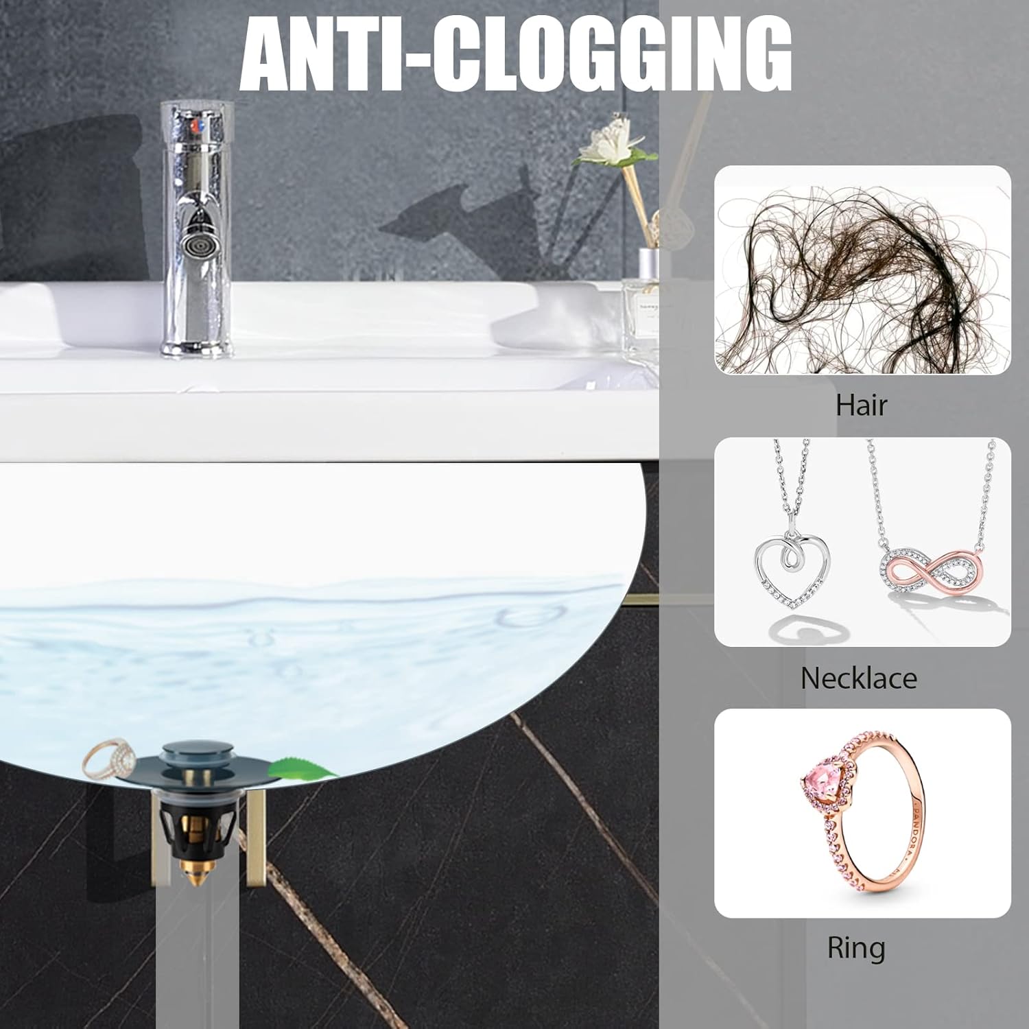 - 2 In 1 Design: The bathroom sink drain strainer has built-in spring that switches freely between pop-up and sealed states with touch. Best of all, it has an anti-clogging basket filter inside that prevents clogged drains such as hair, bracelets