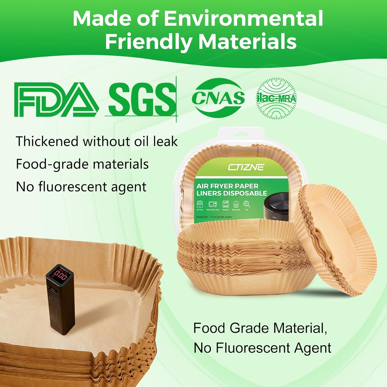 - Liners Size: Ctizne air fryer paper liners are in 8 inches at bottom diameter, suitable for both round and square baskets between 5 and 8 qt. Heat resistant temperatures up to 428 fahrenheit