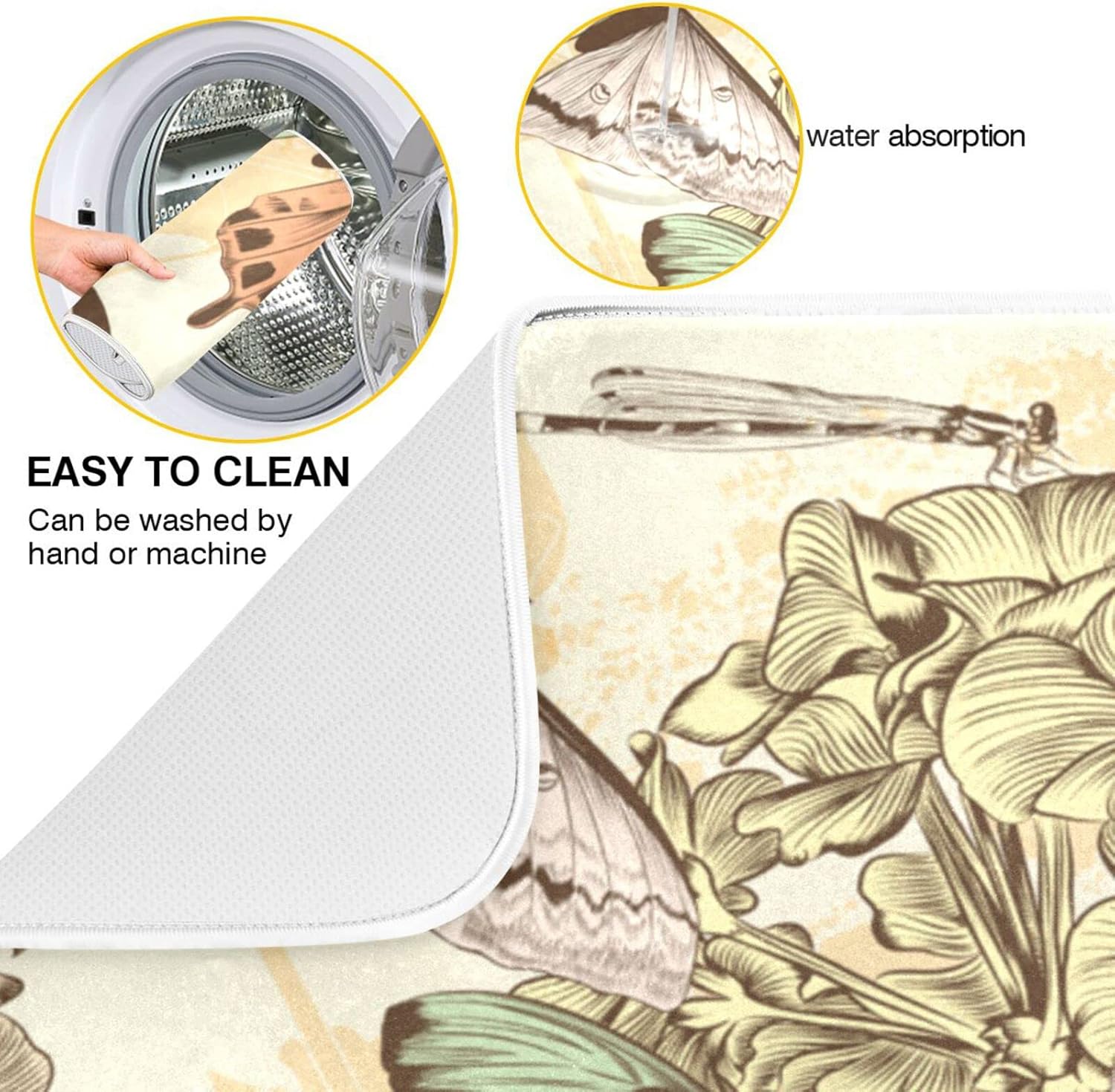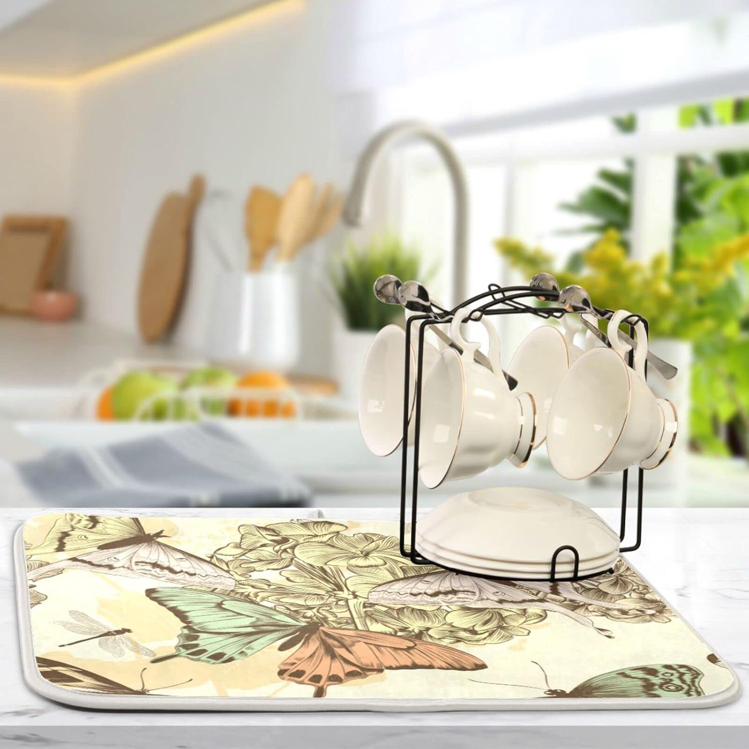 Super Absorbent Dish Drying Mat, Microfiber Fast-Drying Dish Mat, 16" x 18", Kitchen Dish Drying Pad, Retro Butterfly