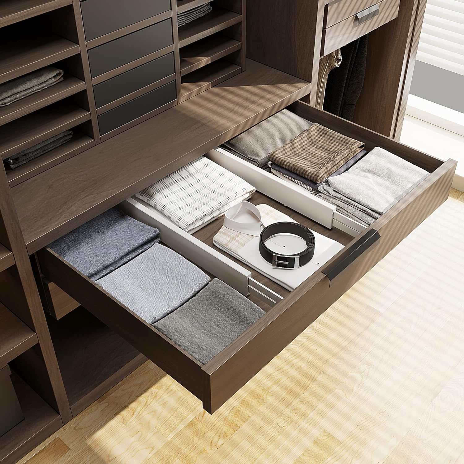 - MULTIPUL USED FOR ORGANIZATION: You can use BAMEOS drawer dividers in any drawers of your bedroom, office, kitchen, living room and garage; It can keep your drawer neat and organized all the time