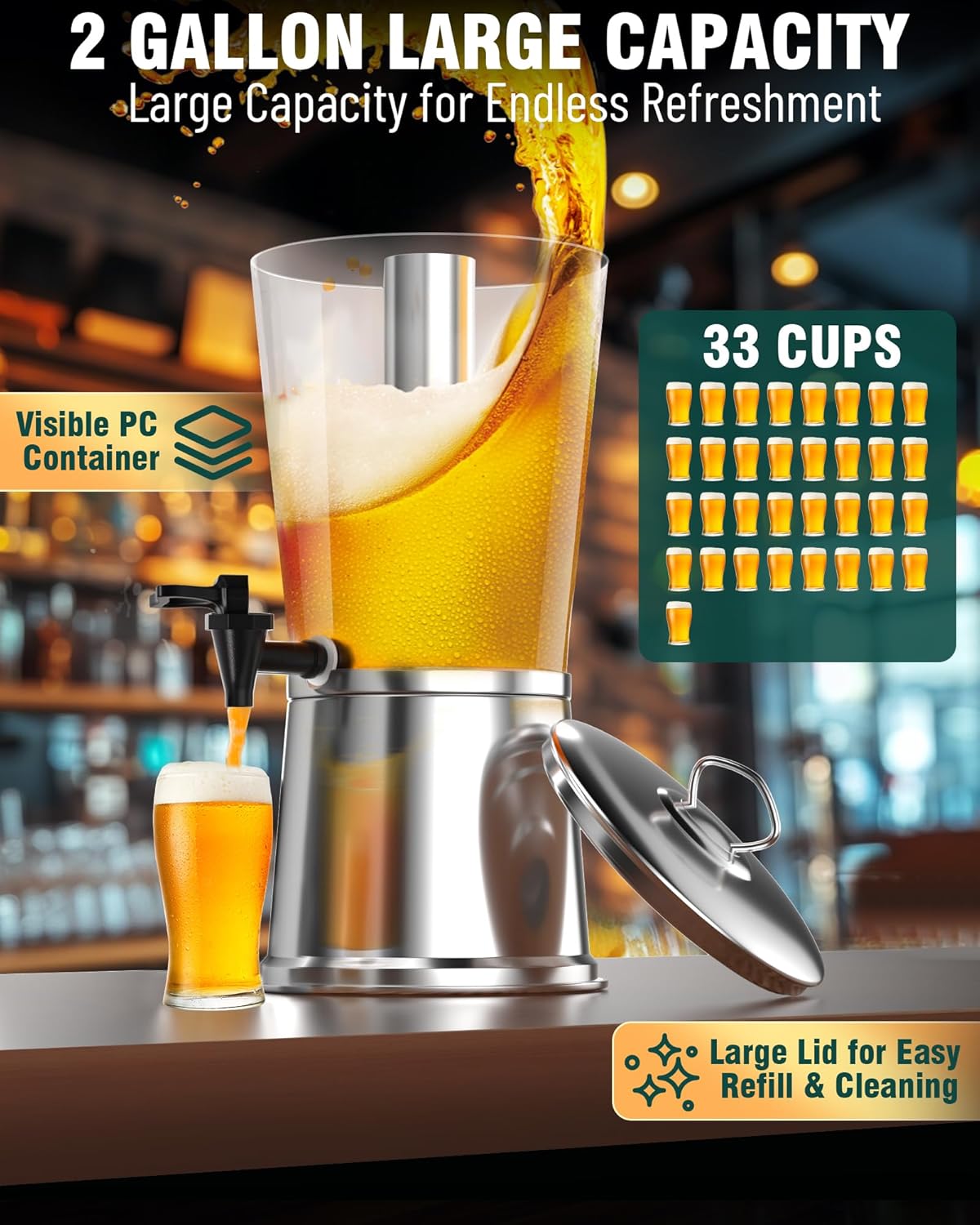 - LARGE CAPACITY & EASY TO USE: The 2-gallon large capacity provides 33 cups of 8oz drinks, so you don't need to refill drinks frequently. With a spacious lid for easy refilling and cleaning, our 2 gallon beverage dispenser with stand lets you see the remaining drink level clearly. It's perfect for busy bars and events, making self-service a breeze.