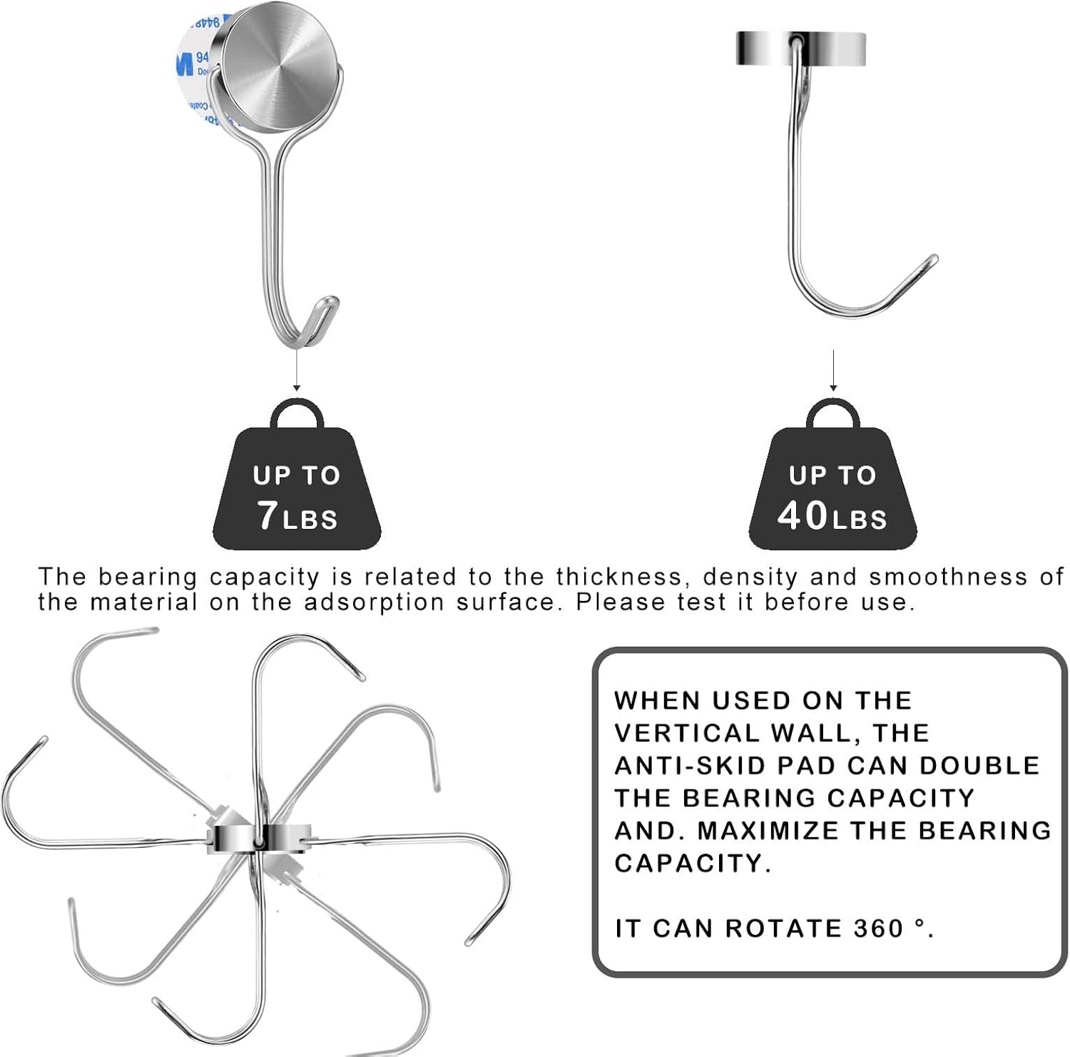 - 【Equipped with Non-slip Pad】Using with anti-slip pads which enables magnetic hook to bear more weight when use horizontally, such as refrigerators and iron doors, the load-bearing capacity can be double, so no need to worry about items slipping off.