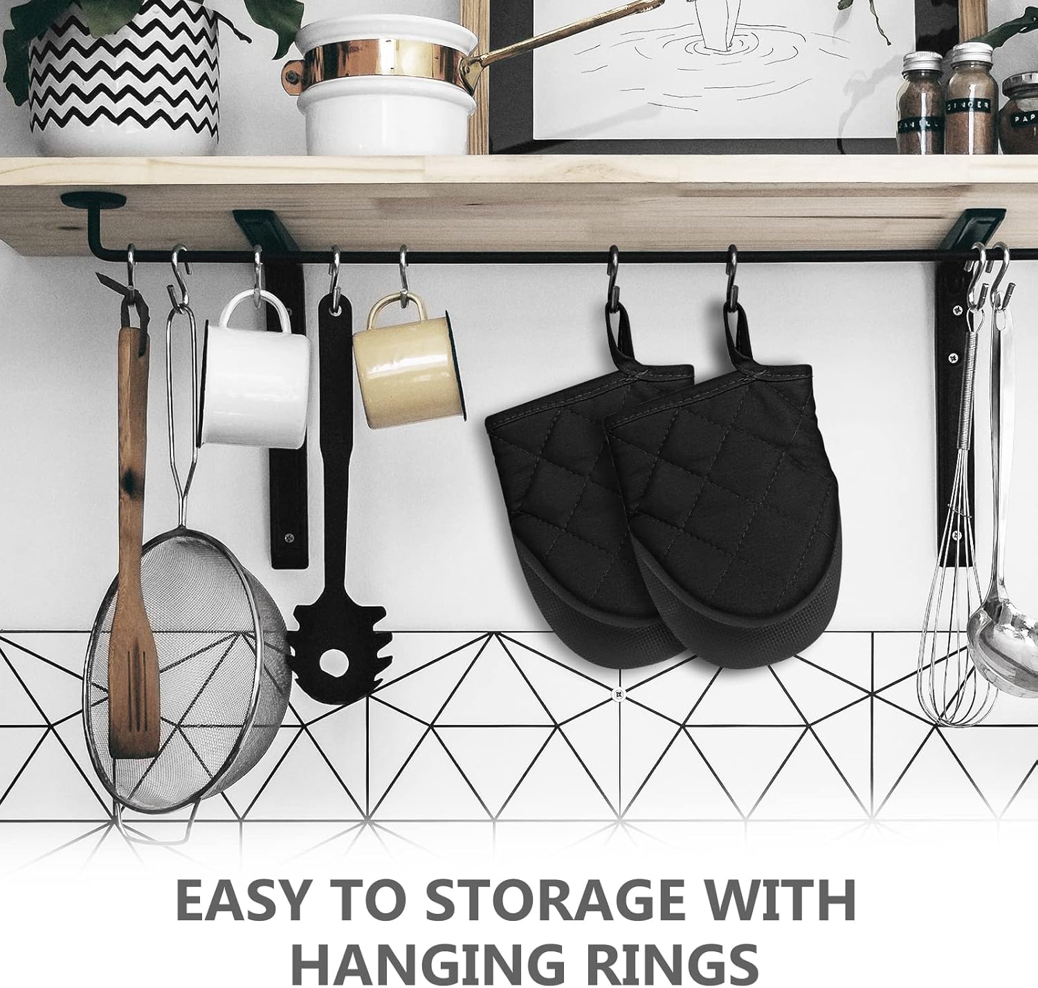 Qulable 1 Pair Short Oven Mitts - Silicone Kitchen Oven Gloves High Heat Resistant 500℉, Mini Oven Mits with Non-Slip Grip Surfaces and Hanging Loop for BBQ, Baking, Cooking and Grilling (Black)
