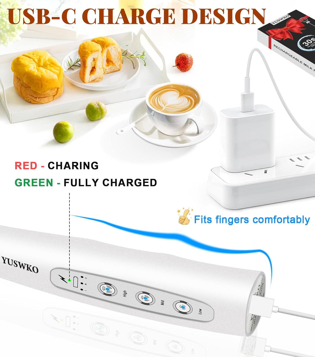 - 🎀【USB-C Rechargeable Milk Frother】This electric milk frother is powered by a built-in 1200mAh rechargeable battery, no need to replace any batteries, environmentally friendly and durable. Compared with the traditional Micro USB charging port, the USB-C charging port design makes it more compatible and faster charging. The charging indicator light is red when charging, and green when fully charged.