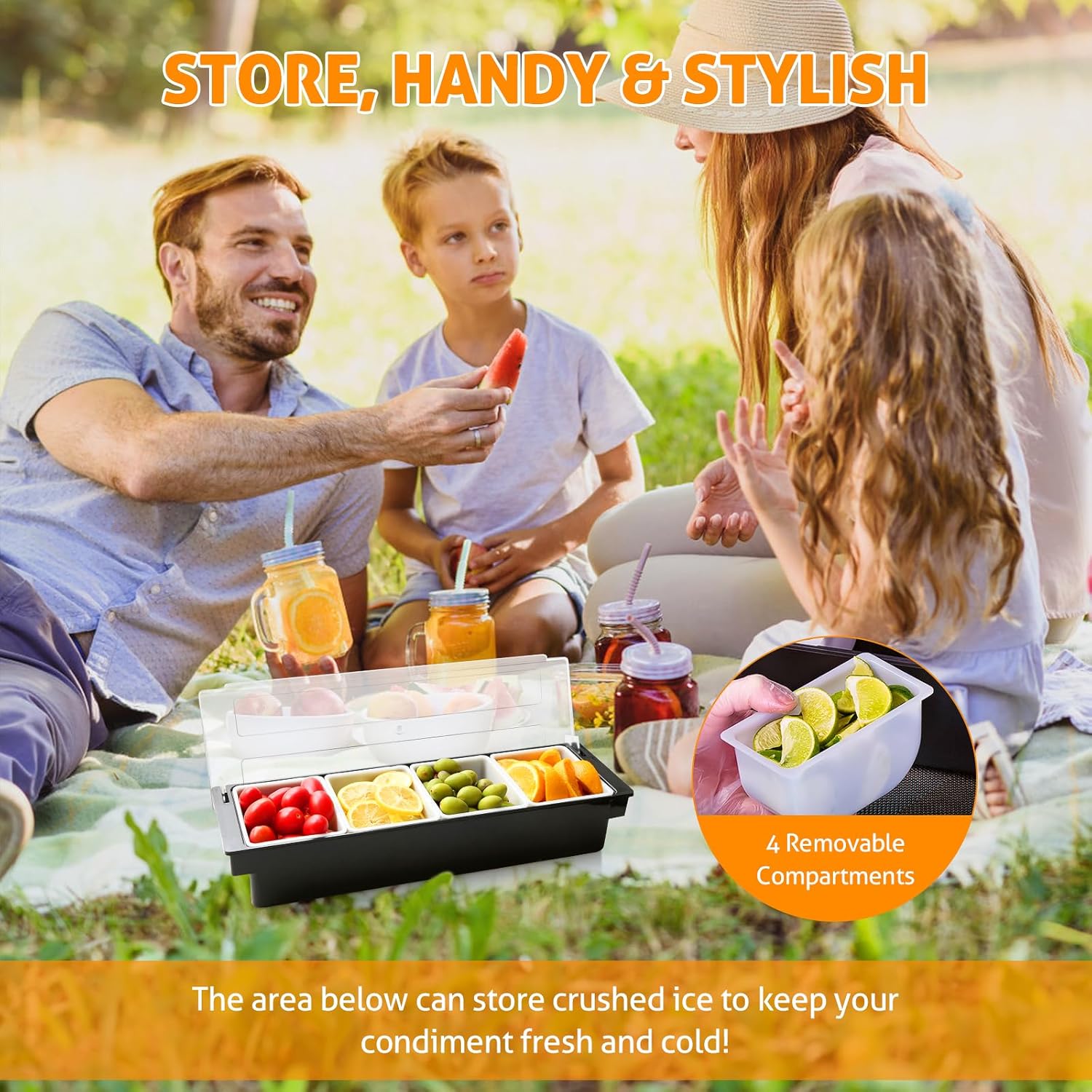 - ORGANIZE CONDIMENTS & GARNISHES - Our portable caddy has multi trays that have enough space to hold party food items, such as olives, pickles, fruit slices, nuts, seeds, gray, sauces and salad dips.