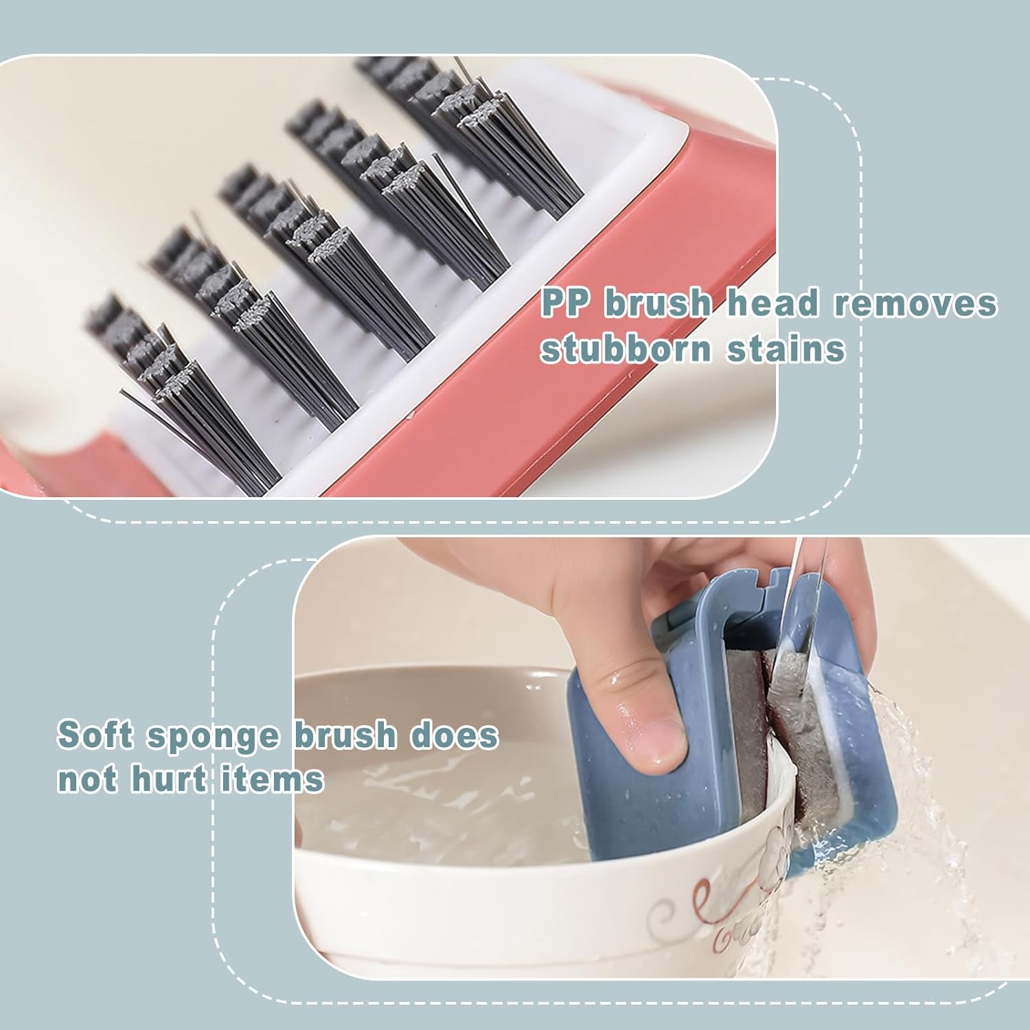 - ✅【U-shaped design】: This brush can brush two sides at the same time, which is convenient and time-saving. The unique U-shape design protects your hands from injury when you brush things with sharp edges. Makes cleaning knives, cutlery and forks easier and safer.