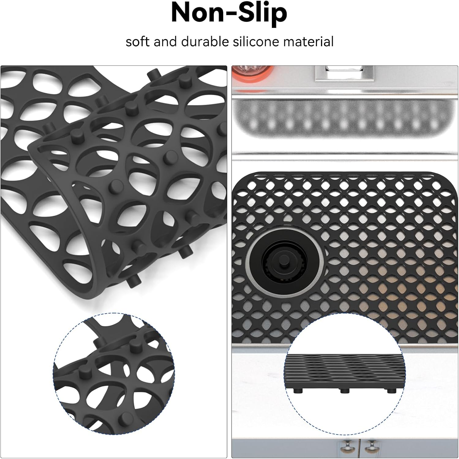 - Heat Resistance: Silicone drying mat for kitchen sink can handle temperatures up to 500F so you can safely place hot pans and dishes on the sink mat directly from the oven or stove to prevent damage to the table from the heat