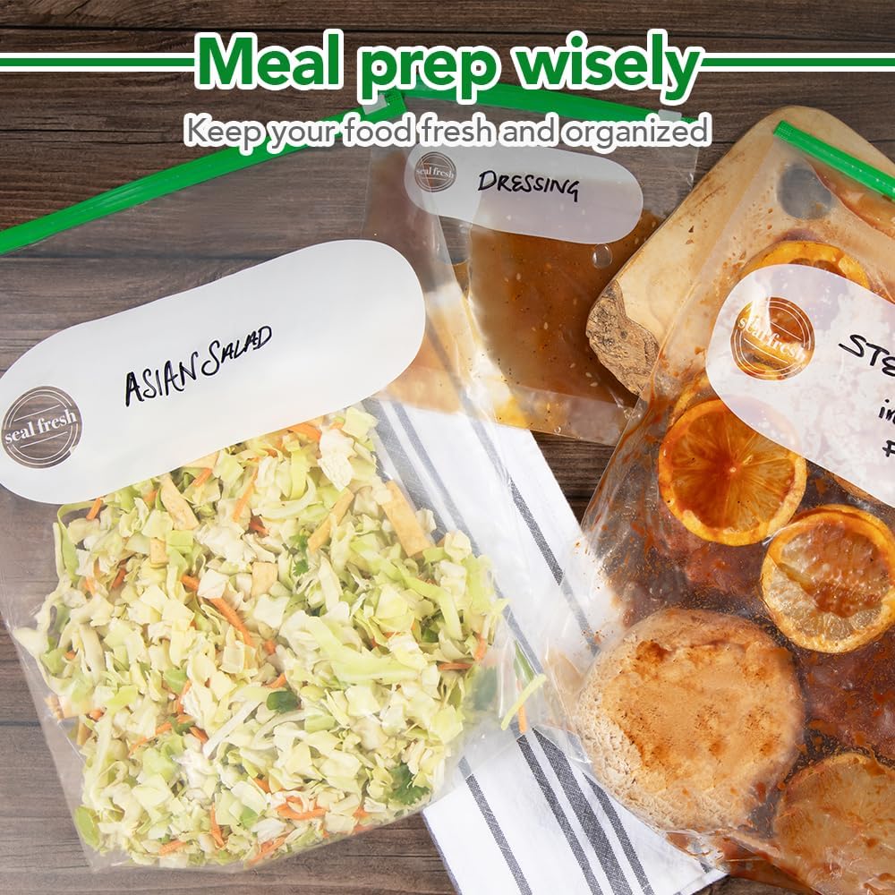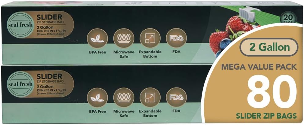 - [SECURE & SPACIOUS STORAGE]: Generously sized to accommodate multiple items and quanitites - Seal Fresh's 2 Gallon slider plastic bags feature an expandable bottom, allowing them to stand upright for easy filling and storage of bulky items, leftovers, or organizing bigger batches of food or supplies.