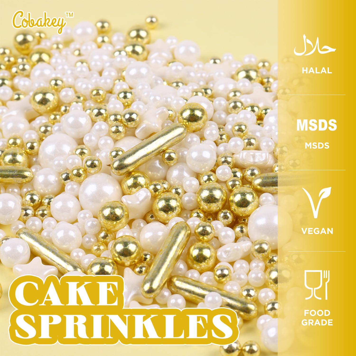- Pearl Sprinkles: Each bottle weighs 4.23 oz, 120 g. Our white & gold sprinkles are made from safe ingredients, Nut Free. Our cake sprinkles are in different shapes of Star and Pearl Sprinkles.
