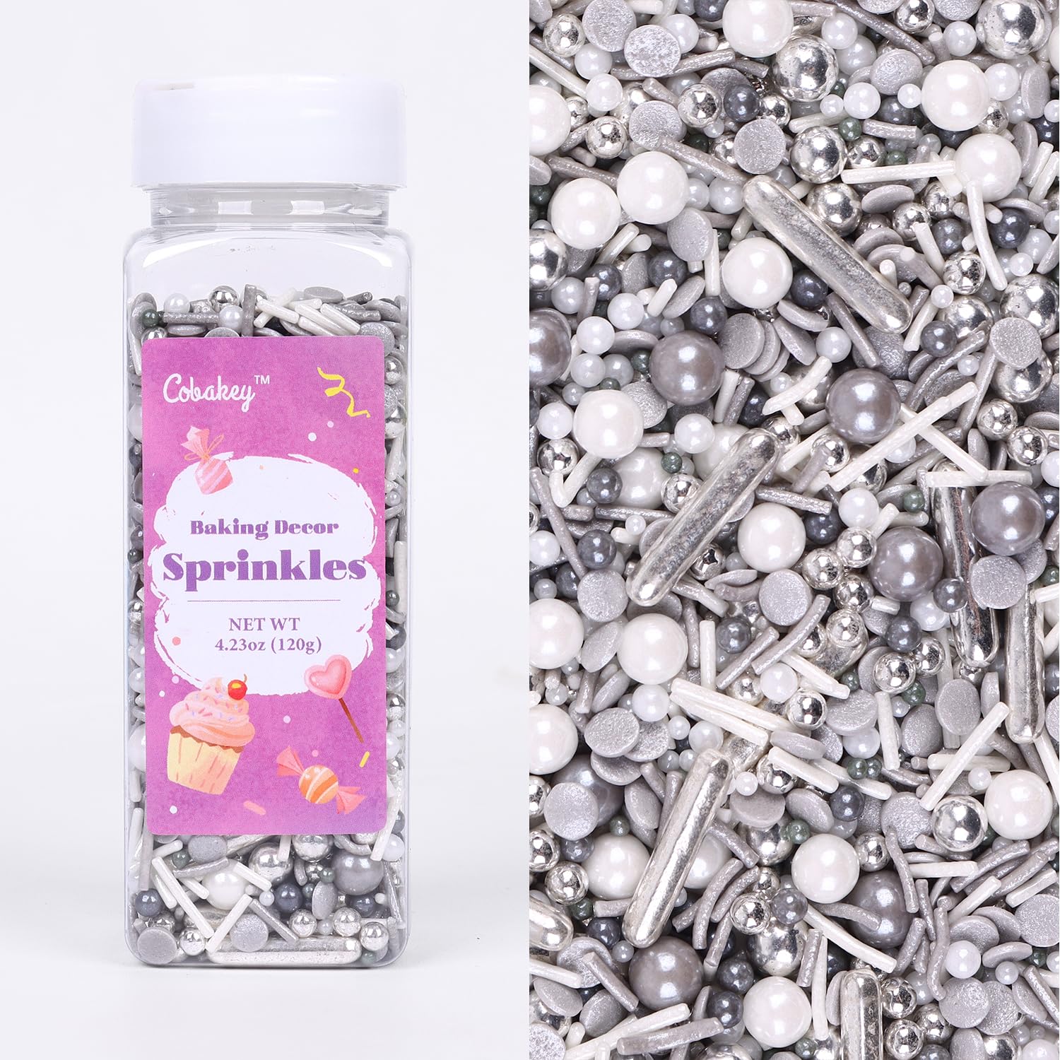 - Pearl Sprinkles: Each bottle weighs 4.23 oz, 120 g. Our gray & silver sprinkles are made from safe ingredients, Nut Free. Our cake sprinkles are in different shapes of Metallic and Pearl Sprinkles.