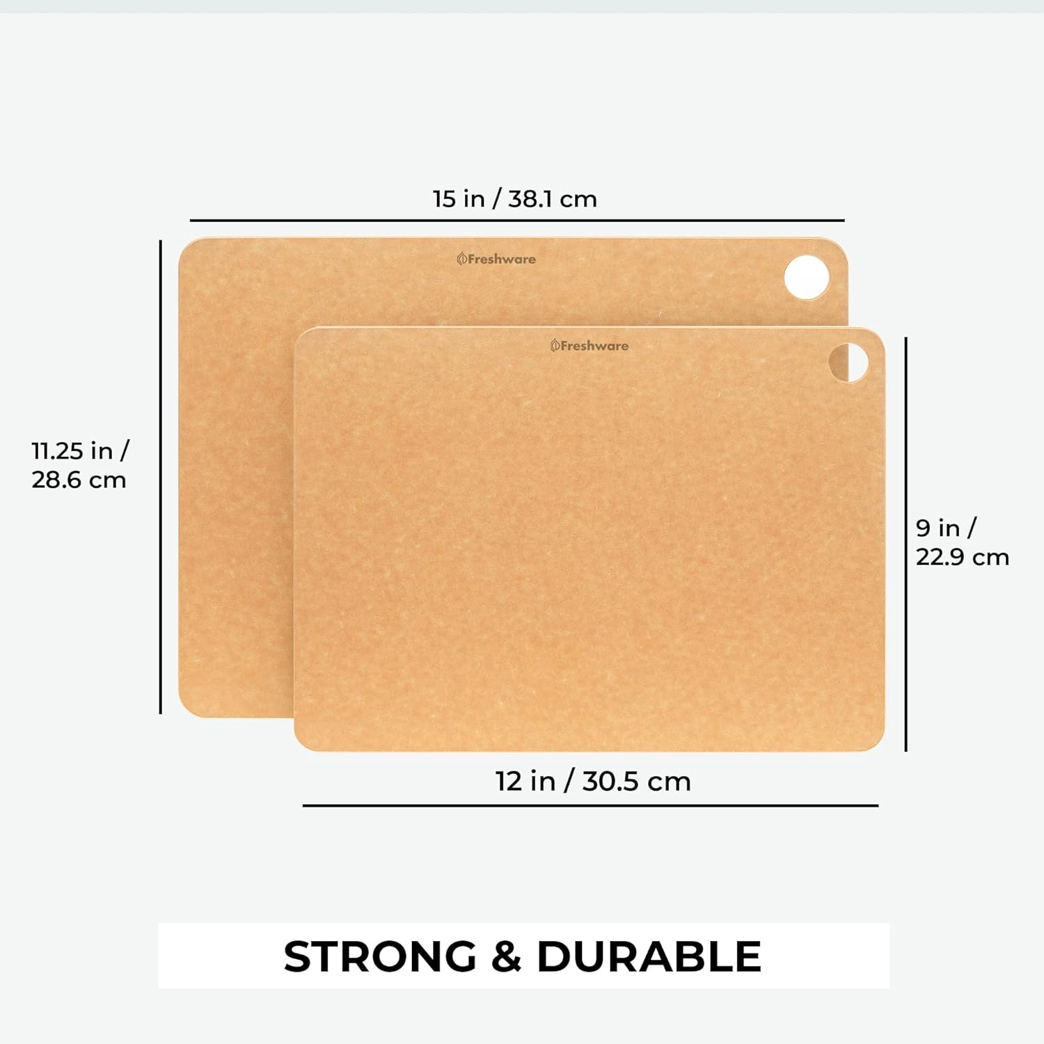 - Easy To Clean and Dishwasher Safe: Set of 2, Medium 12" x 9" and Large, 15" x 11.25" wood fiber cutting board, wooden natural color, dual-sided cutting surface. If you are looking for a crafted wood cutting board that is extremely safe to use, then we got you covered. BPA-free, dishwasher safe, Freshware wood cutting boards provide a clean food prep surface for every meal.